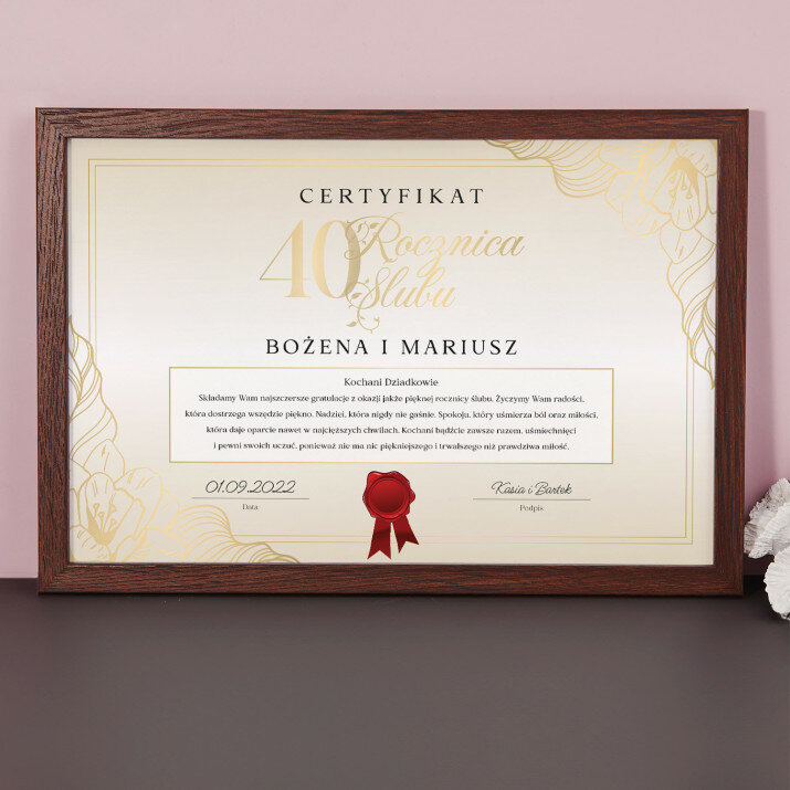 Certyfikat wydrukowany jest na wysokiej jakości papierze fotograficznym w formacie 20 x 30 cm. Finalnie Certyfikat oprawiony jest w elegancką ramkę z płyty MDF w formacie 20x30cm. Oferujemy opcję wyboru jasnej lub ciemniejszej ramki, dostosowanej do indywidualnych preferencji, aby podkreślić wartość i znaczenie certyfikatu.CZAS REALIZACJI