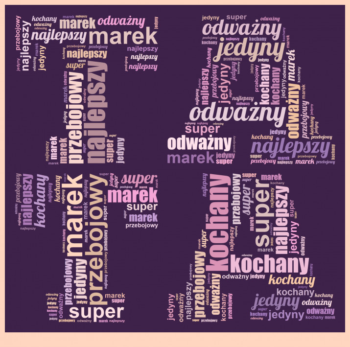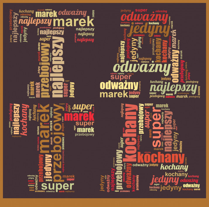 Obraz na płótnie Chmura Słów to wybrany projekt, który składa się z przesłanych przez Ciebie słów. Dzięki takiemu prezentowi możesz przekazać wiele życzeń, albo emocjonalną wiadomość w unikalny sposób. Możliwość personalizacji obrazu pozwala na stworzenie wyjątkowego i jedynego w swoim rodzaju prezentu.Personalizacja