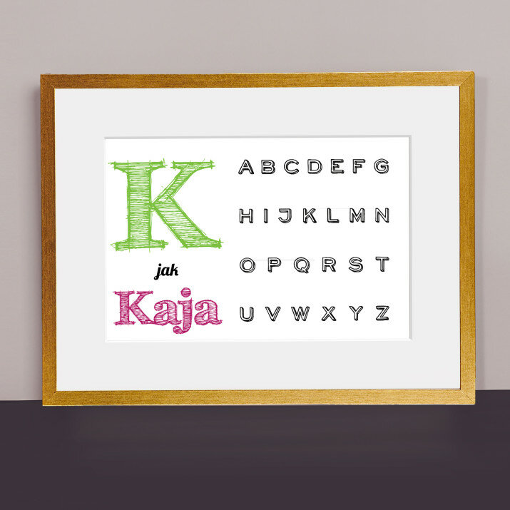 Wydruk liter alfabetu z wyróżnioną pierwszą literą imienia dziecka.