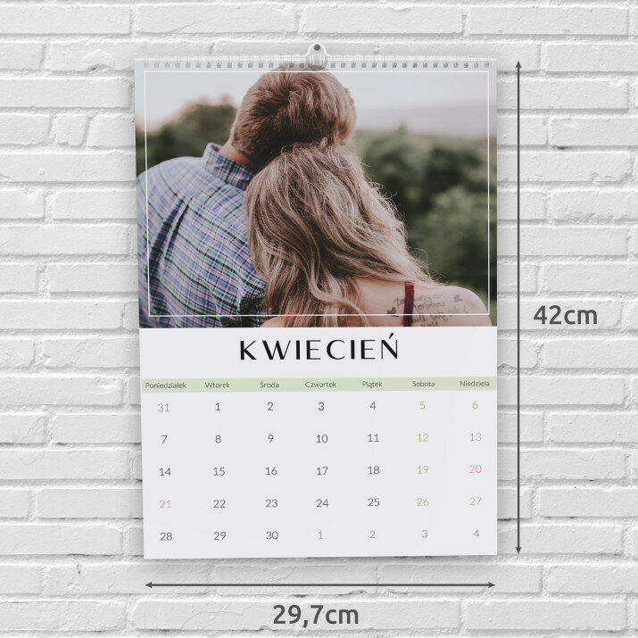 Kalendarz dostępny jest w 3 formatach do wyboru:- A3 (kartki o wymiarach 297 x 420 mm),
