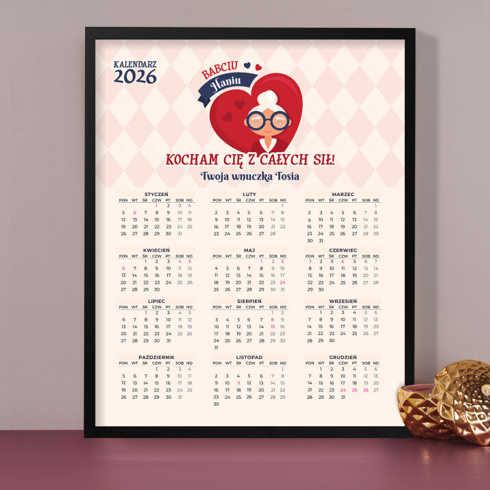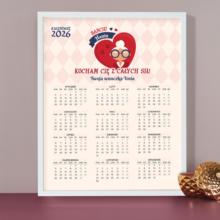 Personalizowany kalendarz oprawiony w ramkę to świetny pomysł na prezent, który idealnie sprawdzi się w każdym wnętrzu! Cały rok został umieszczony na jednej stronie, dzięki czemu od razu widoczny jest układ wszystkich miesięcy. Nadruk wykonany na papierze foto wygląda pięknie, kolory są nasycone, a efekt trwały. Jest to idealny upominek i pamiątka w jednym!Wymiary: 40 x 50 cm