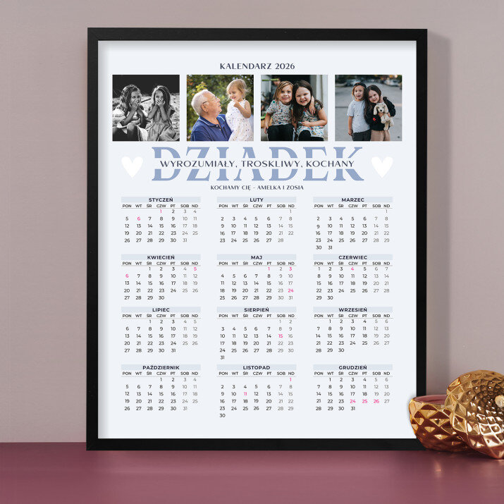 Personalizowany kalendarz oprawiony w ramkę to świetny pomysł na prezent, który idealnie sprawdzi się w każdym wnętrzu! Cały rok został umieszczony na jednej stronie, dzięki czemu od razu widoczny jest układ wszystkich miesięcy. Nadruk wykonany na papierze foto wygląda pięknie, kolory są nasycone, a efekt trwały. Jest to idealny upominek i pamiątka w jednym!