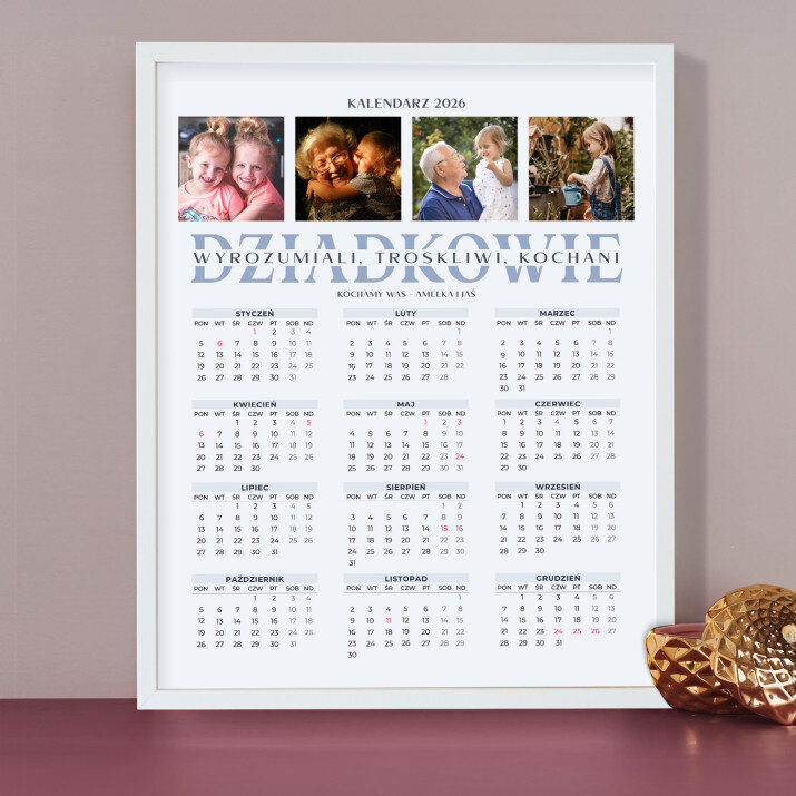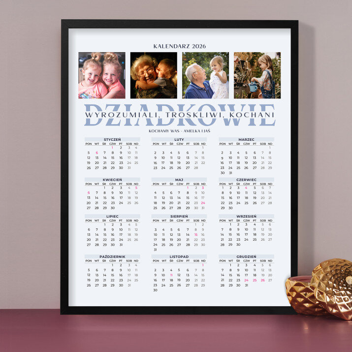 Personalizowany kalendarz oprawiony w ramkę to świetny pomysł na prezent, który idealnie sprawdzi się w każdym wnętrzu! Cały rok został umieszczony na jednej stronie, dzięki czemu od razu widoczny jest układ wszystkich miesięcy. Nadruk wykonany na papierze foto wygląda pięknie, kolory są nasycone, a efekt trwały. Jest to idealny upominek i pamiątka w jednym!