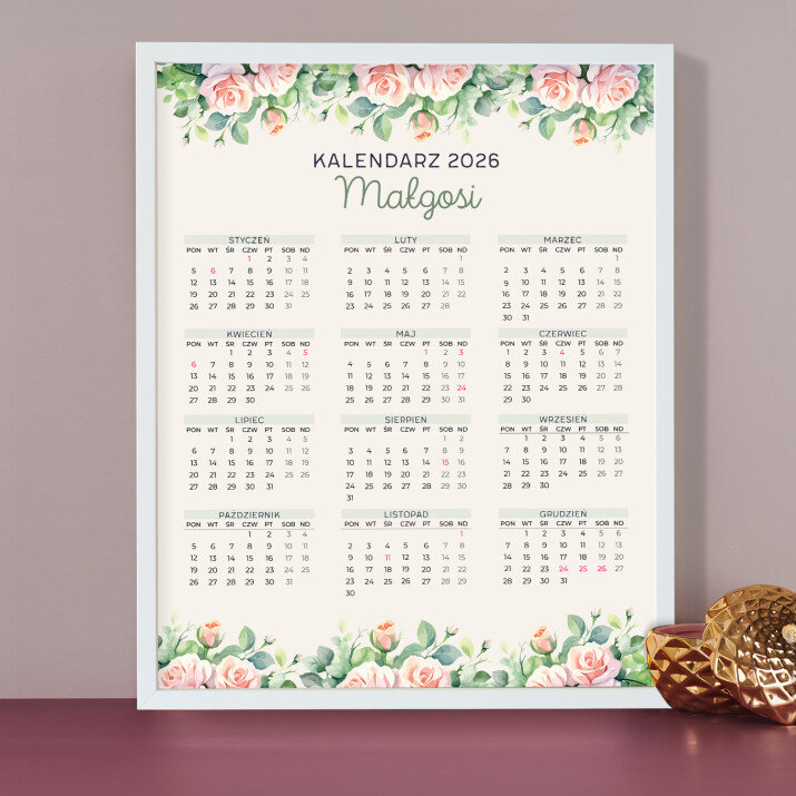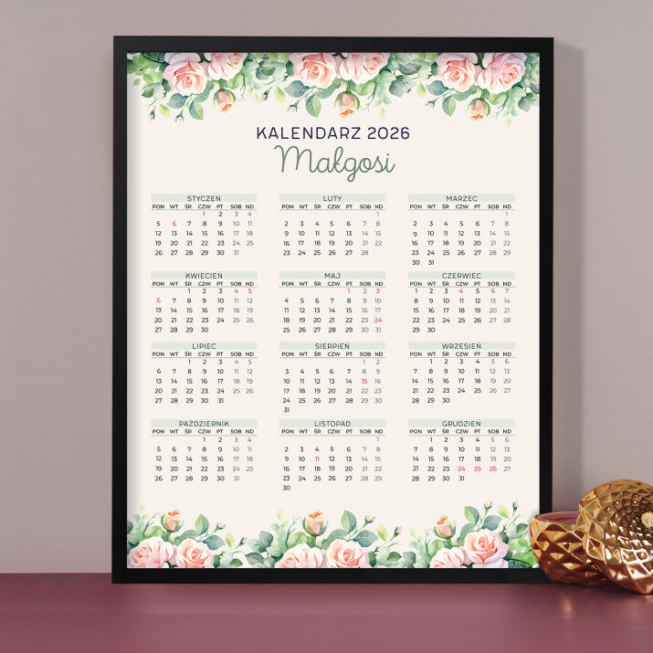 Personalizowany kalendarz oprawiony w ramkę to świetny pomysł na prezent, który idealnie sprawdzi się w każdym wnętrzu! Cały rok został umieszczony na jednej stronie, dzięki czemu od razu widoczny jest układ wszystkich miesięcy. Nadruk wykonany na papierze foto wygląda pięknie, kolory są nasycone, a efekt trwały. Jest to idealny upominek i pamiątka w jednym!Wymiary: 40 x 50 cm