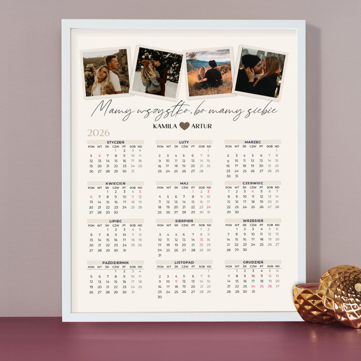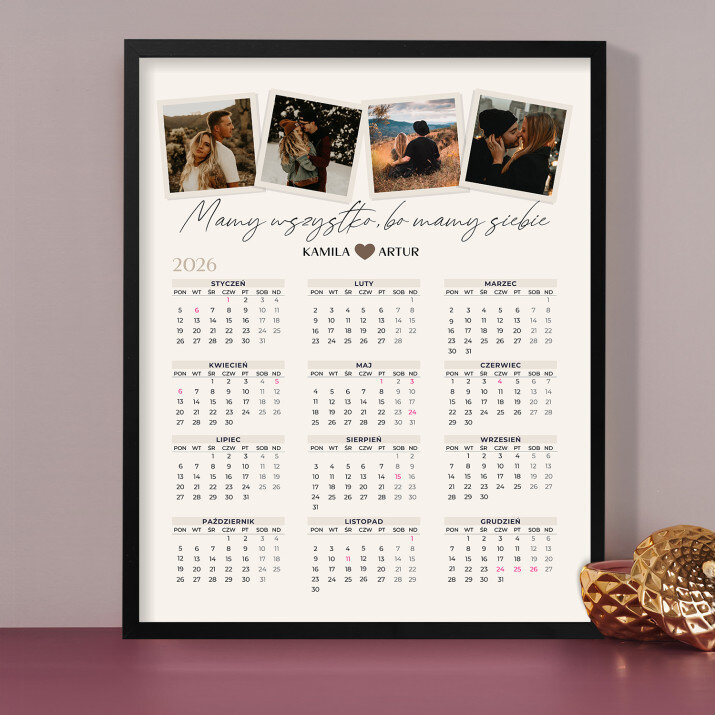 Personalizowany kalendarz oprawiony w ramkę to świetny pomysł na prezent, który idealnie sprawdzi się w każdym wnętrzu! Cały rok został umieszczony na jednej stronie, dzięki czemu od razu widoczny jest układ wszystkich miesięcy. Nadruk wykonany na papierze foto wygląda pięknie, kolory są nasycone, a efekt trwały. Jest to idealny upominek i pamiątka w jednym!Wymiary: 40 x 50 cm