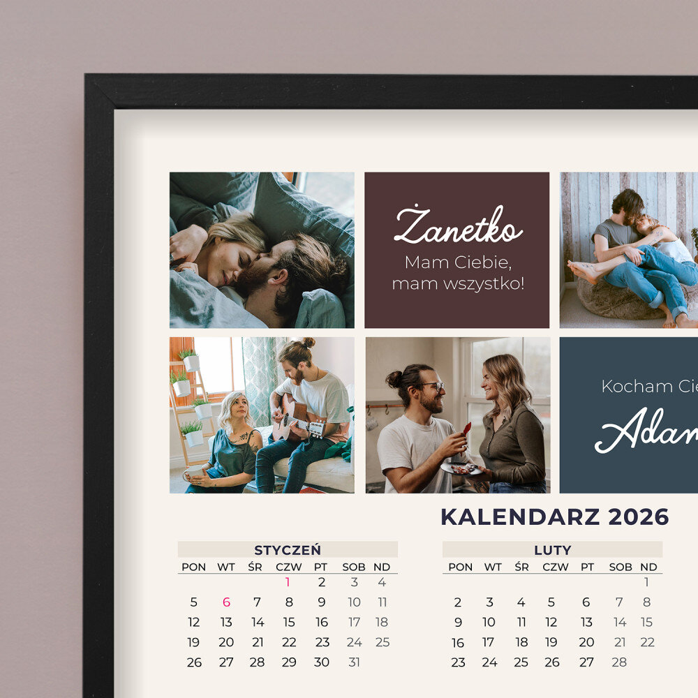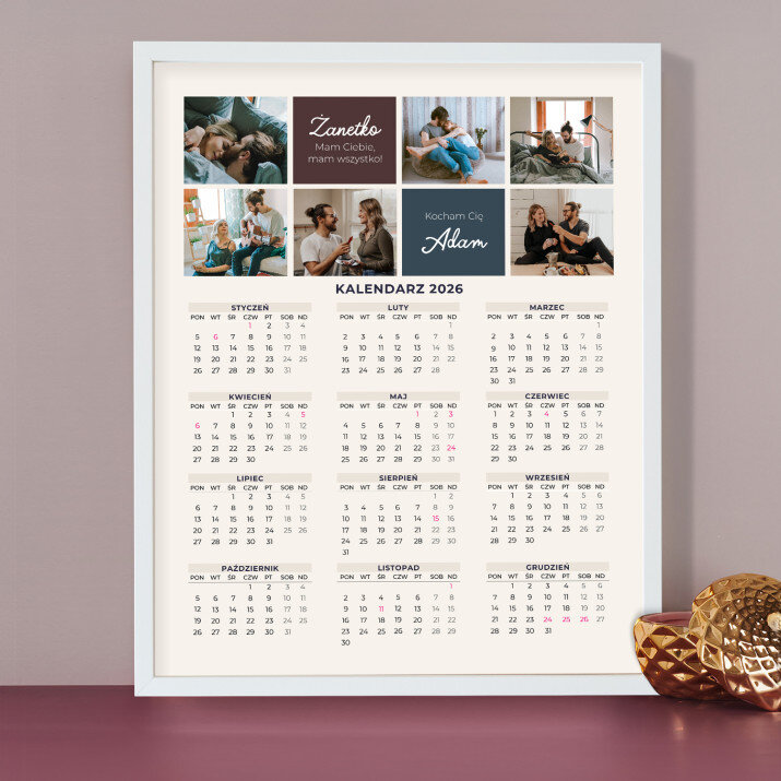 Personalizowany kalendarz oprawiony w ramkę to świetny pomysł na prezent, który idealnie sprawdzi się w każdym wnętrzu! Cały rok został umieszczony na jednej stronie, dzięki czemu od razu widoczny jest układ wszystkich miesięcy. Nadruk wykonany na papierze foto wygląda pięknie, kolory są nasycone, a efekt trwały. Jest to idealny upominek i pamiątka w jednym!Wymiary: 40 x 50 cm