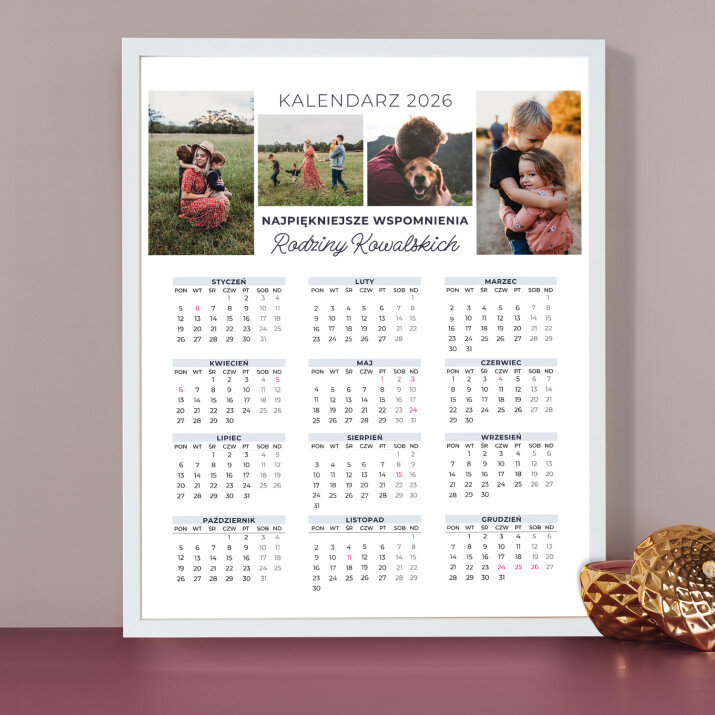 Personalizowany kalendarz oprawiony w ramkę to świetny pomysł na prezent, który idealnie sprawdzi się w każdym wnętrzu! Cały rok został umieszczony na jednej stronie, dzięki czemu od razu widoczny jest układ wszystkich miesięcy. Nadruk wykonany na papierze foto wygląda pięknie, kolory są nasycone, a efekt trwały. Jest to idealny upominek i pamiątka w jednym!