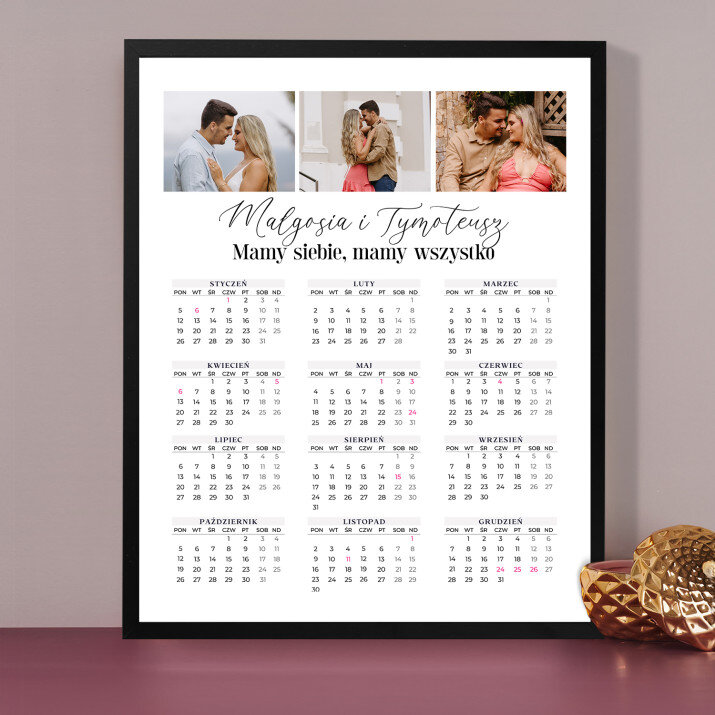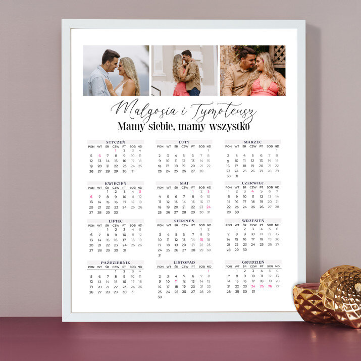 Personalizowany kalendarz oprawiony w ramkę to świetny pomysł na prezent, który idealnie sprawdzi się w każdym wnętrzu! Cały rok został umieszczony na jednej stronie, dzięki czemu od razu widoczny jest układ wszystkich miesięcy. Nadruk wykonany na papierze foto wygląda pięknie, kolory są nasycone, a efekt trwały. Jest to idealny upominek i pamiątka w jednym!Wymiary: 40 x 50 cm
