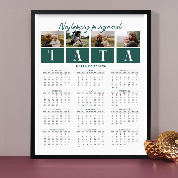 Personalizowany kalendarz oprawiony w ramkę to świetny pomysł na prezent, który idealnie sprawdzi się w każdym wnętrzu! Cały rok został umieszczony na jednej stronie, dzięki czemu od razu widoczny jest układ wszystkich miesięcy. Nadruk wykonany na papierze foto wygląda pięknie, kolory są nasycone, a efekt trwały. Jest to idealny upominek i pamiątka w jednym!Wymiary: 40 x 50 cm