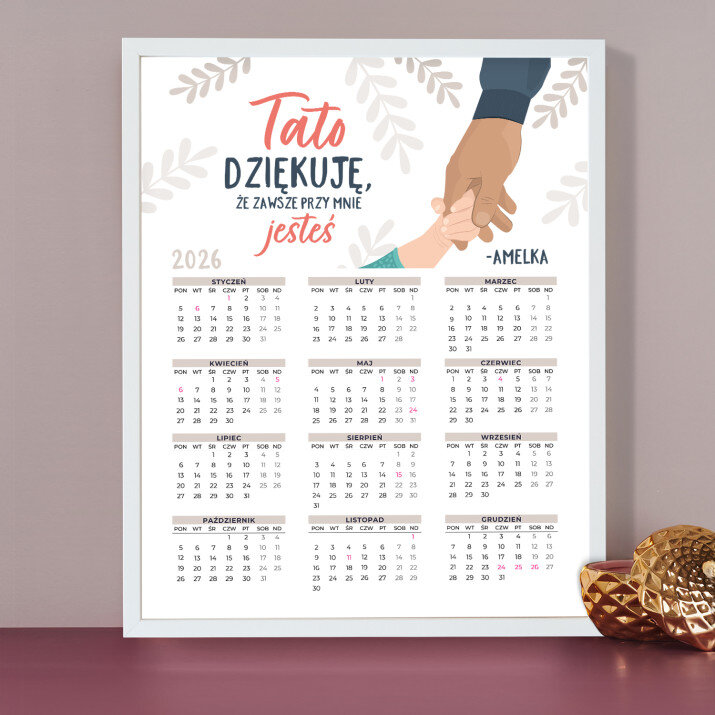 Personalizowany kalendarz oprawiony w ramkę to świetny pomysł na prezent, który idealnie sprawdzi się w każdym wnętrzu! Cały rok został umieszczony na jednej stronie, dzięki czemu od razu widoczny jest układ wszystkich miesięcy. Nadruk wykonany na papierze foto wygląda pięknie, kolory są nasycone, a efekt trwały. Jest to idealny upominek i pamiątka w jednym!Wymiary: 40 x 50 cm