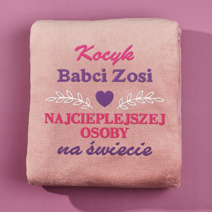 Koc o wymiarach 140 x 200 cm w kolorze szarym lub różowym, wykonany z wysokogatunkowego polaru, charakteryzuje się niepowtarzalną puszystością i miękkością, ozdobiony jednym z naszych personalizowanych haftowanych wzorów.