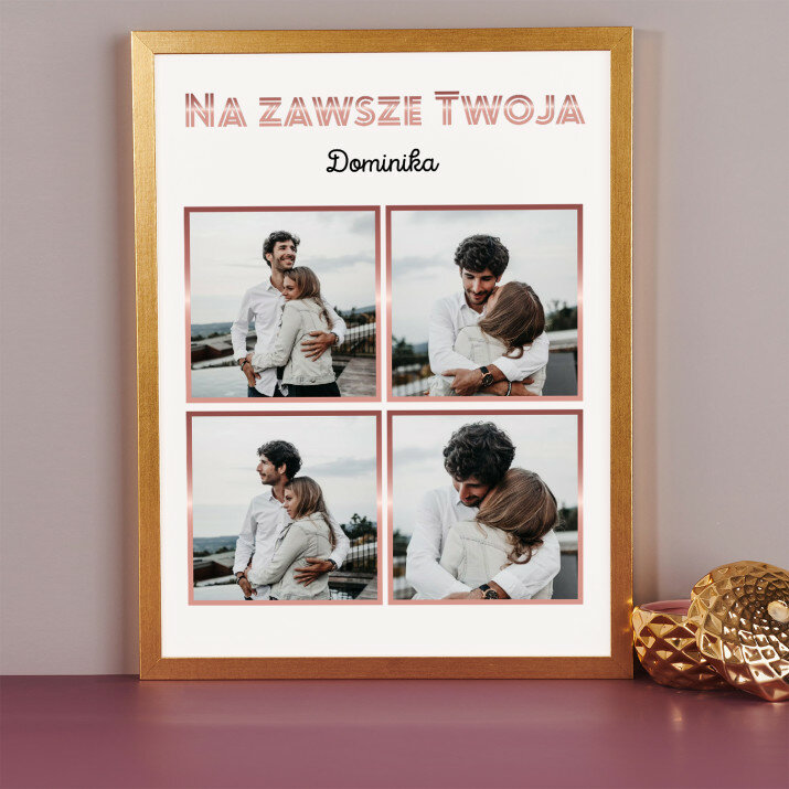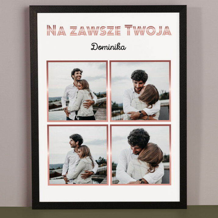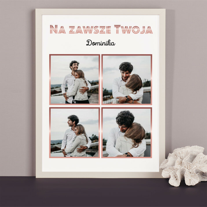 Piękna kompozycja Twoich zdjęć z kilkoma słowami prosto z serca oraz podpisami. Idealny prezent dla tych, z którymi łączy Cię mnóstwo wspomnień. Wystarczy wybrać ulubione fotografie najważniejszych dla Was chwil, a powstanie pamiątka, która zostanie z obdarowaną osobą na zawsze. To również niezwykle oryginalna i efektowna dekoracja do mieszkania.