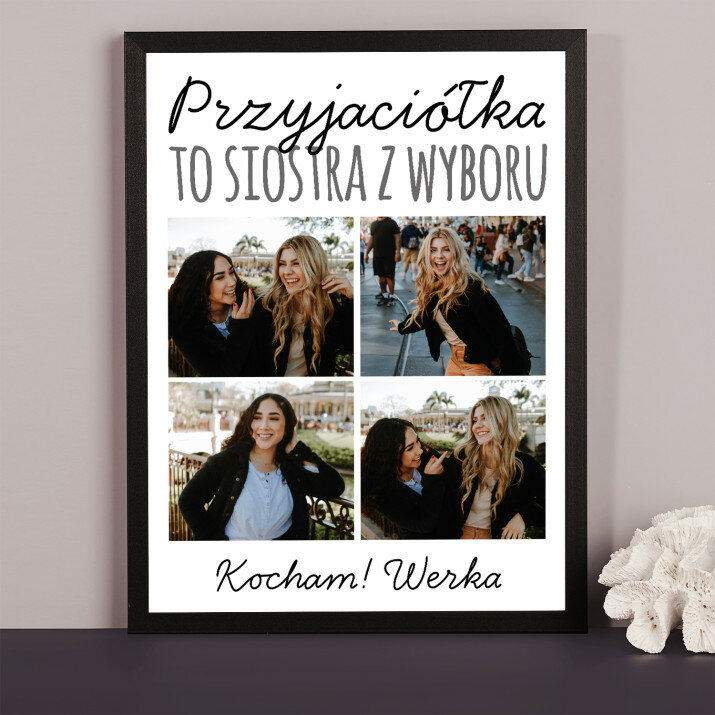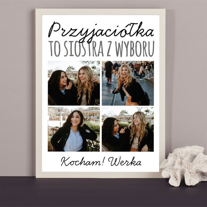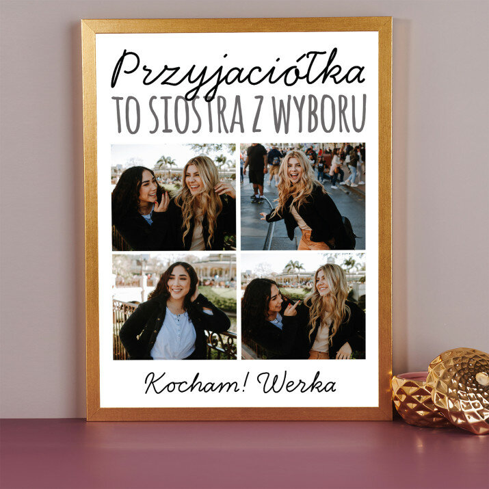 Piękna kompozycja Twoich zdjęć z kilkoma słowami prosto z serca oraz podpisami. Idealny prezent dla tych, z którymi łączy Cię mnóstwo wspomnień. Wystarczy wybrać ulubione fotografie najważniejszych dla Was chwil, a powstanie pamiątka, która zostanie z obdarowaną osobą na zawsze. To również niezwykle oryginalna i efektowna dekoracja do mieszkania.WYKONANIE