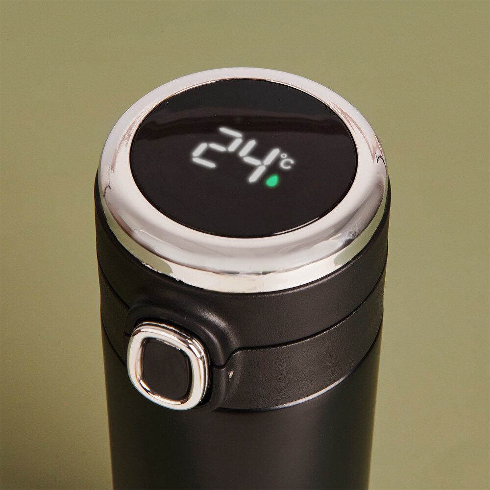 Wyjątkowy kubek termiczny z wyświetlaczem LED w kolorze czarnym to nieoceniony towarzysz Twoich codziennych przygód! Utrzymuje ciepłe napoje przez 13 godzin i nie przecieka, więc spokojnie schowasz go np. w damskiej torebce. Posiada również niezwykle wygodną funkcję, jaką jest dotykowy termometr cyfrowy wbudowany w nakrętkę. Wystarczy obrócić kubek do góry dnem na około 10 sekund i dotknąć nakrętki aby odczytać temperaturę napoju. Wnętrze kubka jest wykonane ze stali nierdzewnej o podwyższonym standardzie. Blokada zamknięcia zapobiegnie przypadkowemu otwarciu przykrywki. Dodatkowo personalizowany grawer z pewnością zachwyci obdarowaną osobę! Jest to idealny prezent dla każdego, kto ceni praktyczne upominki.Wymiary: