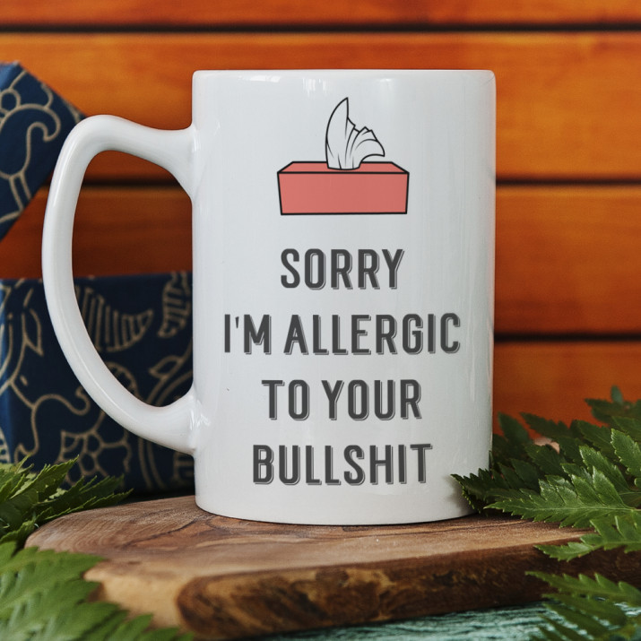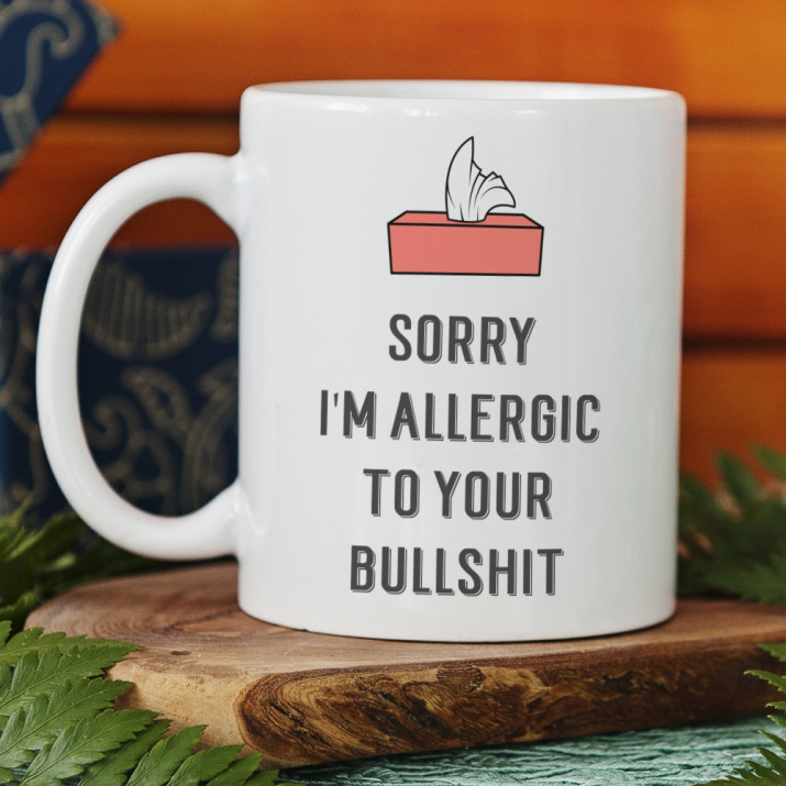 Jedni mają alergię na sierść, inni na klimatyzację w biurze. Może też być alergia na... ekhem... bullshit. Bez zbędnego owijania w bawełnę powiedz o tym na swoim kubku!Wykonanie