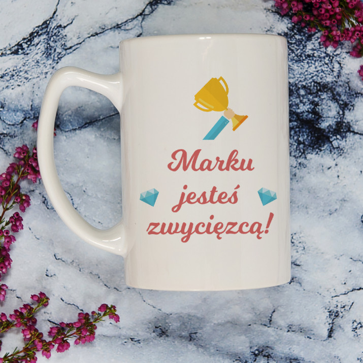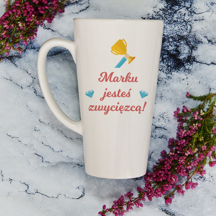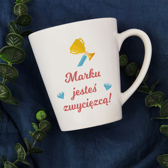 Jesteś zwycięzcą.... jesteś zwycięzcą.... jesteś zwycięzcą..... Zamiast powtarzać to w kółko pomyśl o efektownym kubeczku z tą złotą myślą. Razem z kawą lub herbatą samo wejdzie do głowy!Wykonanie