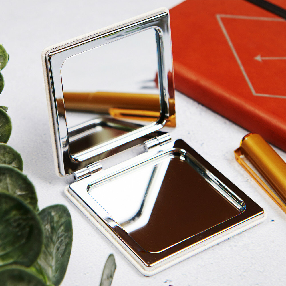 Kieszonkowe, nietłukące się lusterko wykonane z polerowanego metalu, pokryte ekologiczną skórą w kolorze białym. Lusterko jest zarówno standardowe, jak i powiększające, co zapewnia wygodę użytkowania w każdych warunkach. Elegancki, ponadczasowy design trafi w każdy gust. To obowiązkowy element wyposażenia damskiej torebki.