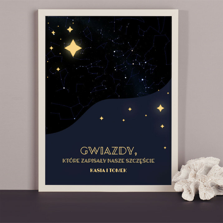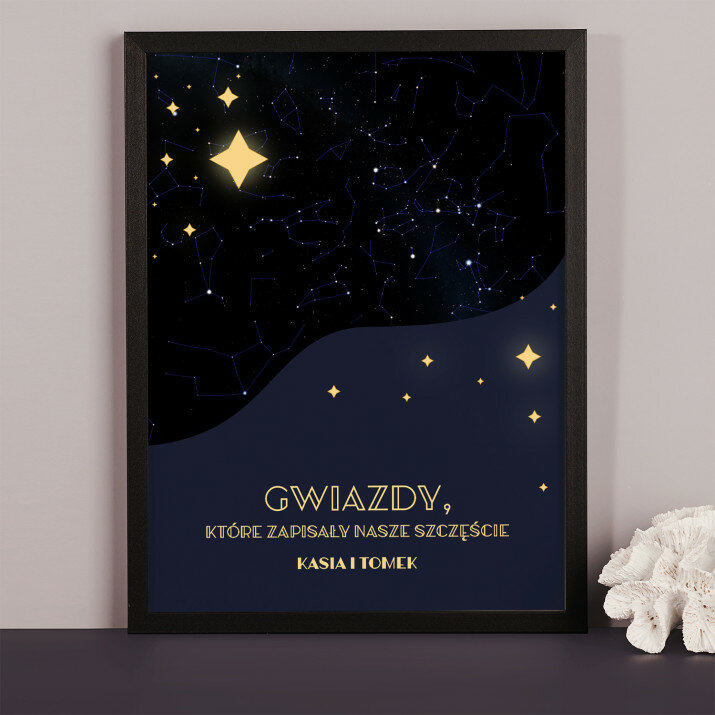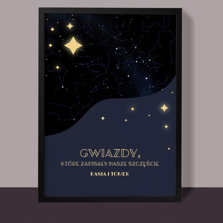 Wyjątkowy plakat w ramce lub obraz na płótnie to piękna i oryginalna pamiątka ważnego dla Ciebie momentu. Podanie wybranego miasta i daty pozwala odtworzyć wygląd nieba i układ gwiazd z tego dnia. Personalizacja obejmuje także podane przez Ciebie imiona, dedykację i inne elementy, dzięki którym taki wydruk stanie się bardzo osobistym i niepowtarzalnym podarunkiem.PERSONALIZACJA