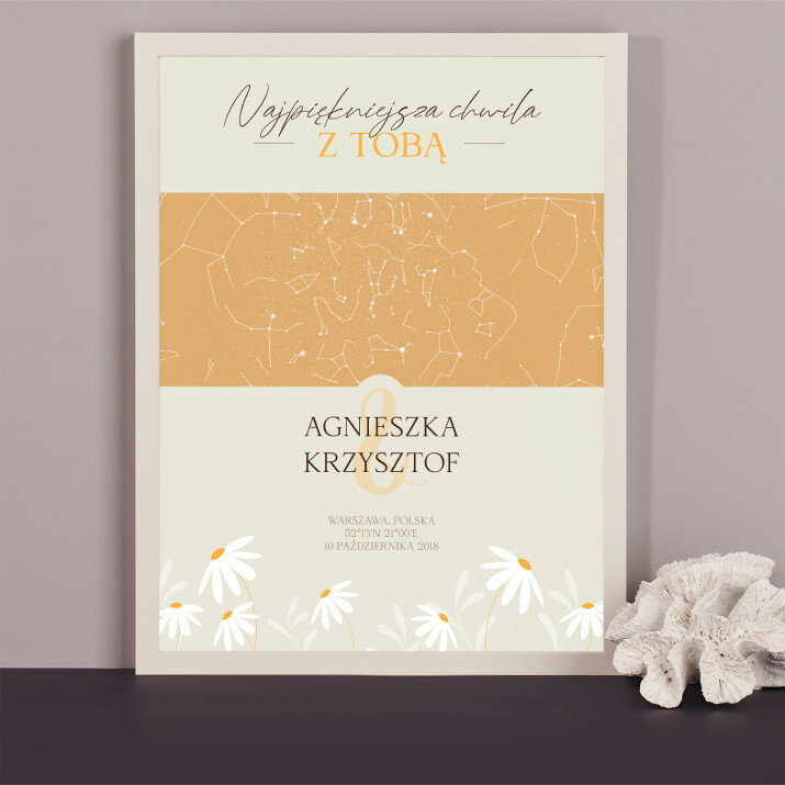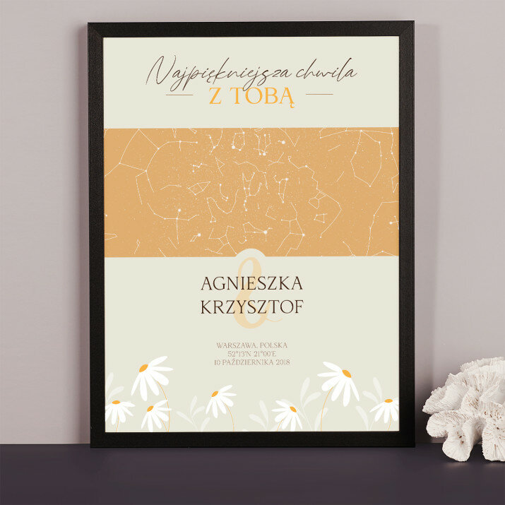 Wyjątkowy plakat w ramce lub obraz na płótnie to piękna i oryginalna pamiątka ważnego dla Ciebie momentu. Podanie wybranego miasta i daty pozwala odtworzyć wygląd nieba i układ gwiazd z tego dnia. Personalizacja obejmuje także podane przez Ciebie imiona, dedykację i inne elementy, dzięki którym taki wydruk stanie się bardzo osobistym i niepowtarzalnym podarunkiem.