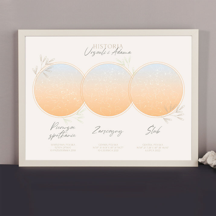 Wyjątkowy plakat w ramce lub obraz na płótnie to piękna i oryginalna pamiątka ważnego dla Ciebie momentu. Podanie wybranego miasta i daty pozwala odtworzyć wygląd nieba i układ gwiazd z tego dnia. Personalizacja obejmuje także podane przez Ciebie imiona, dedykację i inne elementy, dzięki którym taki wydruk stanie się bardzo osobistym i niepowtarzalnym podarunkiem.PERSONALIZACJA