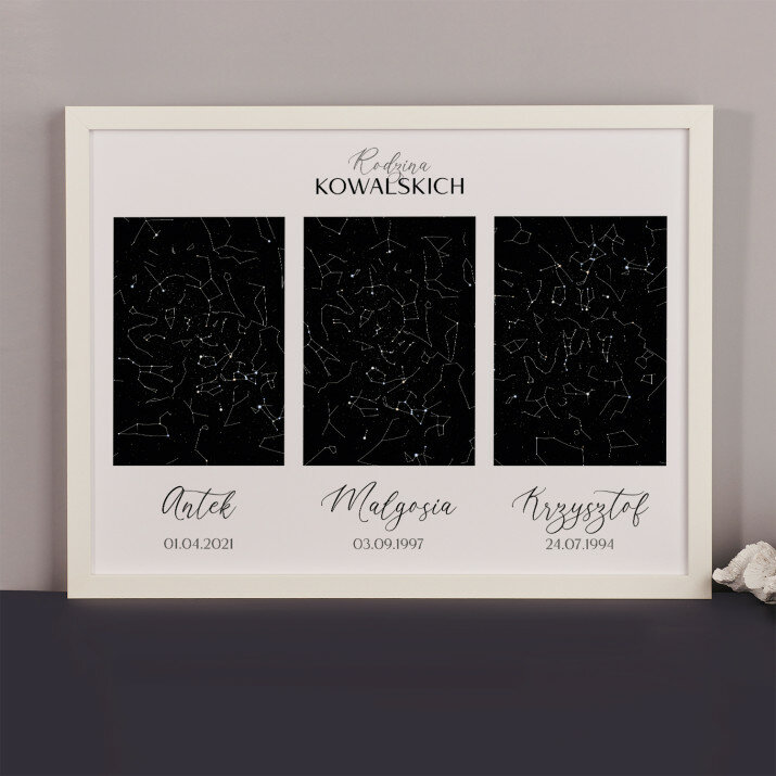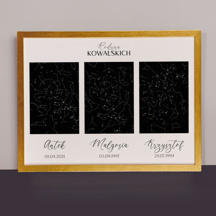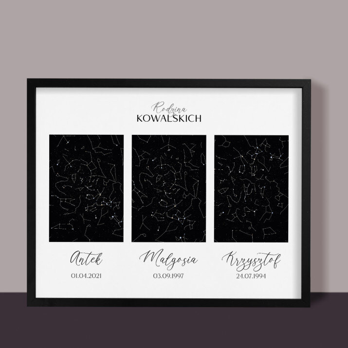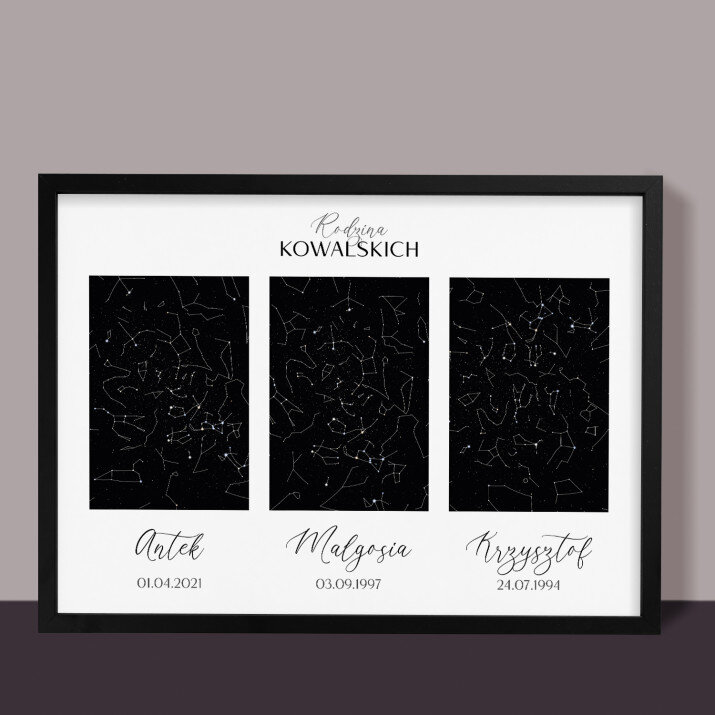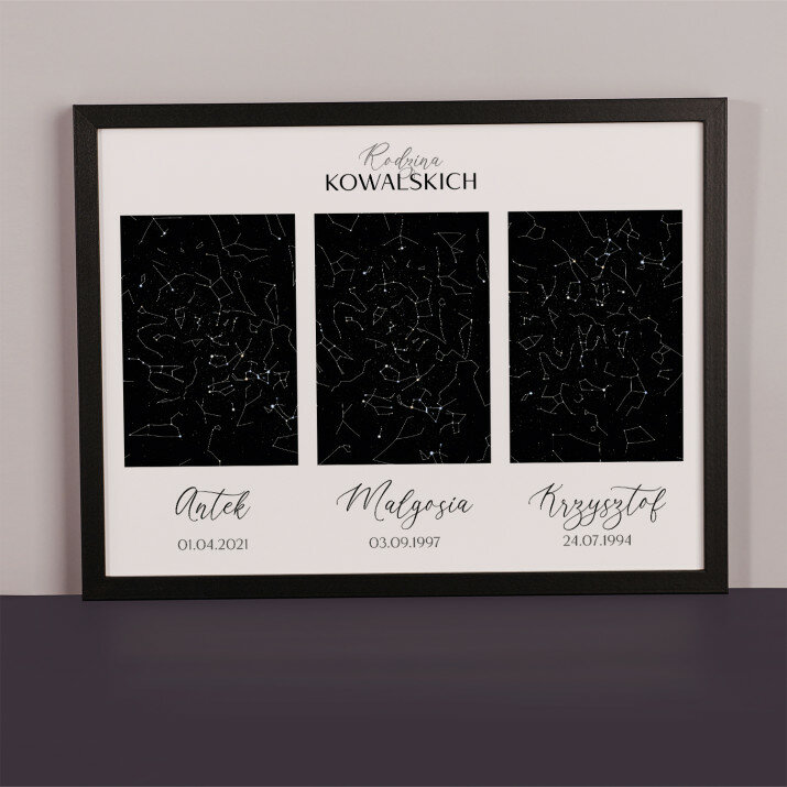 Wyjątkowy plakat w ramce lub obraz na płótnie to piękna i oryginalna pamiątka ważnego dla Ciebie momentu. Podanie wybranego miasta i daty pozwala odtworzyć wygląd nieba i układ gwiazd z tego dnia. Personalizacja obejmuje także podane przez Ciebie imiona, dedykację i inne elementy, dzięki którym taki wydruk stanie się bardzo osobistym i niepowtarzalnym podarunkiem.
