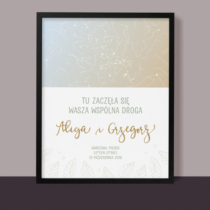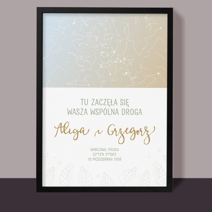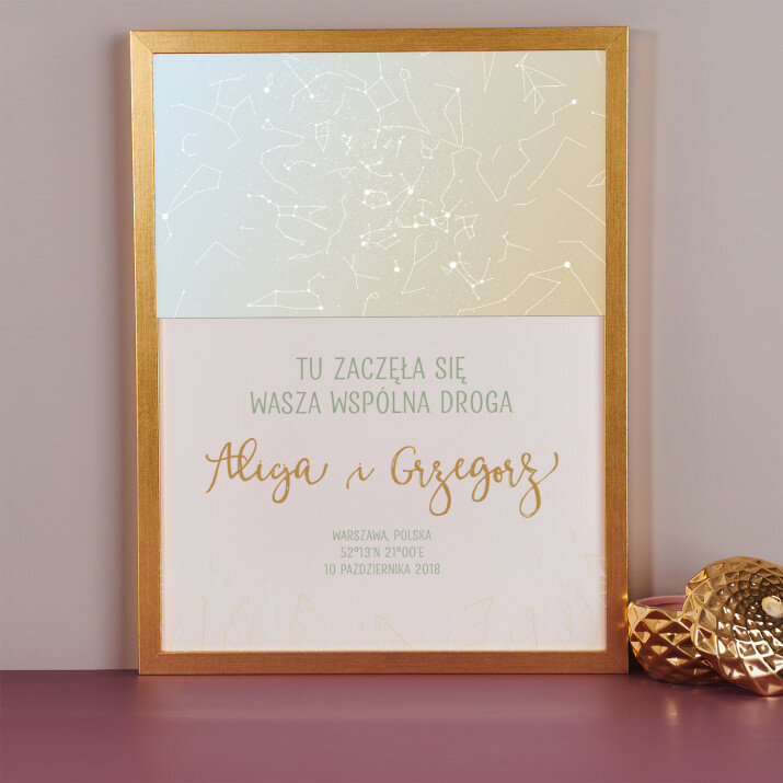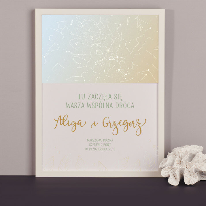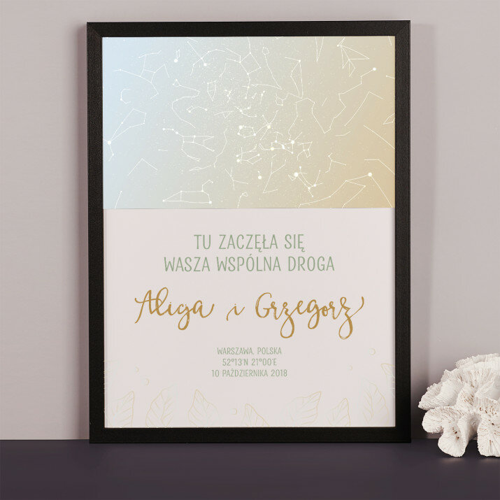 Wyjątkowy plakat w ramce lub obraz na płótnie to piękna i oryginalna pamiątka ważnego dla Ciebie momentu. Podanie wybranego miasta i daty pozwala odtworzyć wygląd nieba i układ gwiazd z tego dnia. Personalizacja obejmuje także podane przez Ciebie imiona, dedykację i inne elementy, dzięki którym taki wydruk stanie się bardzo osobistym i niepowtarzalnym podarunkiem.PERSONALIZACJA