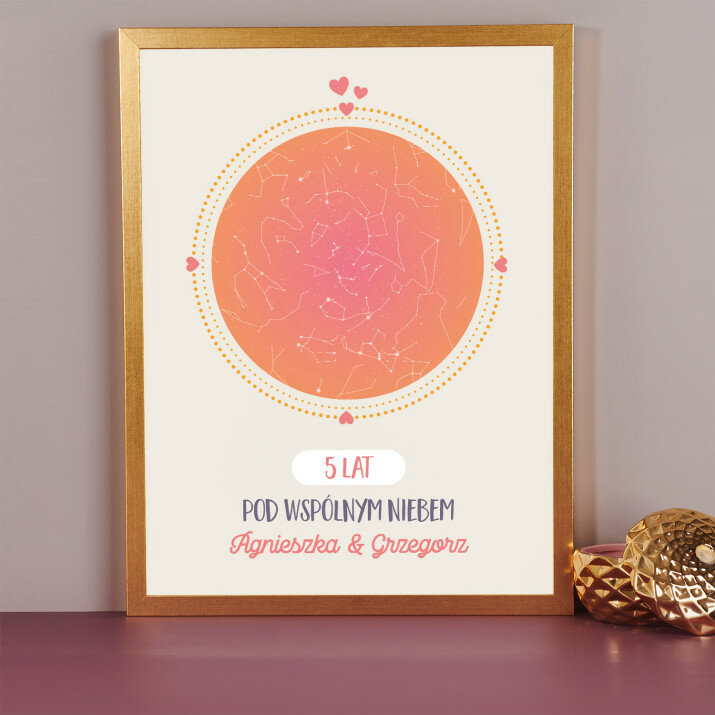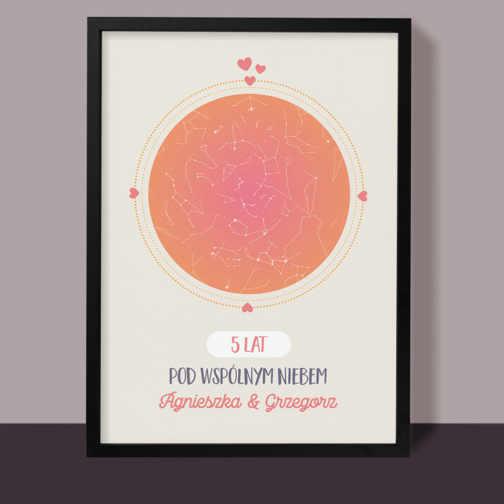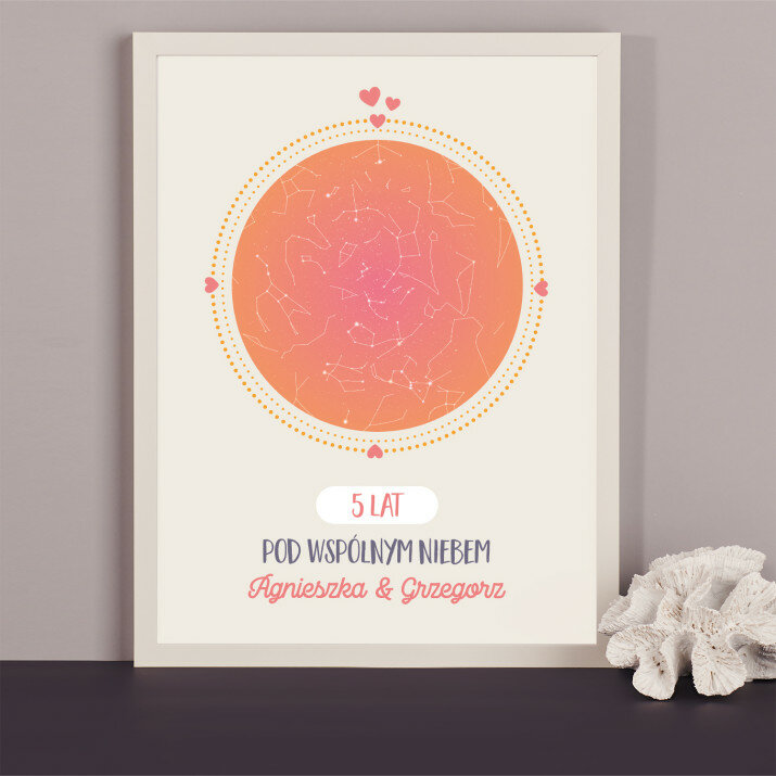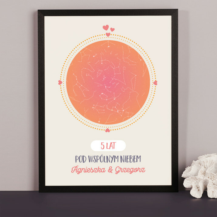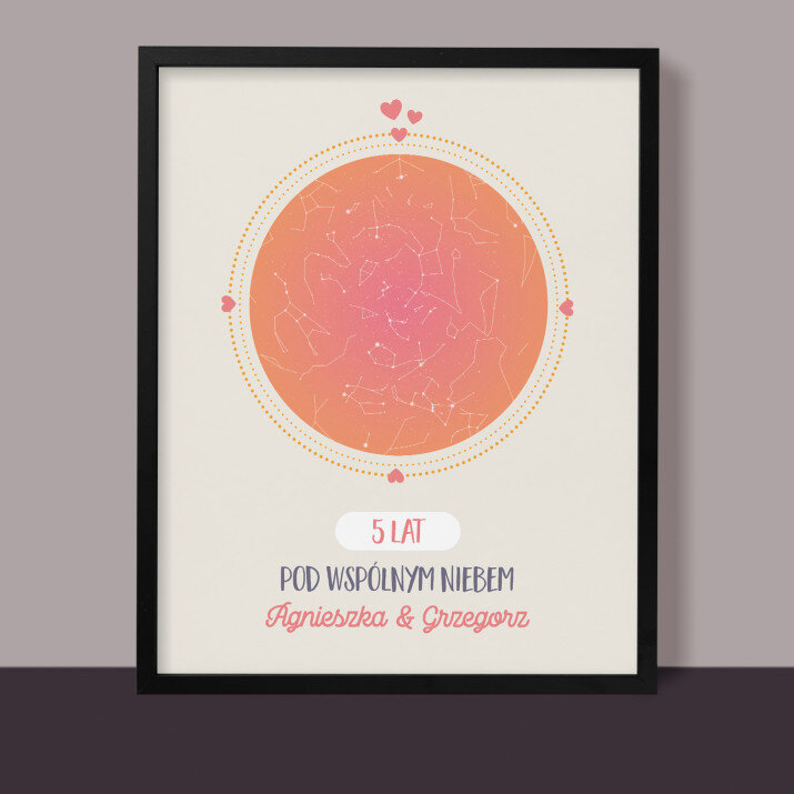 Wyjątkowy plakat w ramce lub obraz na płótnie to piękna i oryginalna pamiątka ważnego dla Ciebie momentu. Podanie wybranego miasta i daty pozwala odtworzyć wygląd nieba i układ gwiazd z tego dnia. Personalizacja obejmuje także podane przez Ciebie imiona, dedykację i inne elementy, dzięki którym taki wydruk stanie się bardzo osobistym i niepowtarzalnym podarunkiem.PERSONALIZACJA
