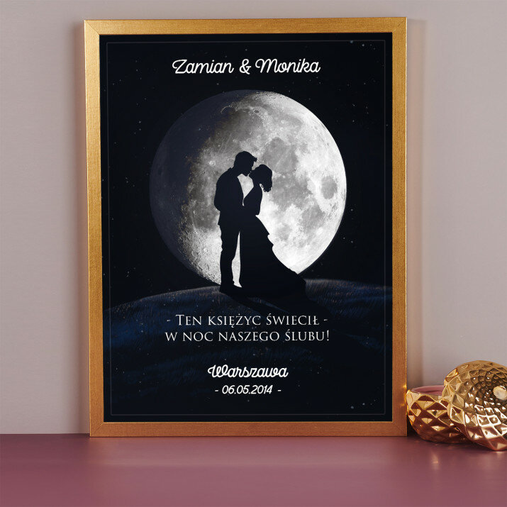 Wyjątkowy plakat z mapą księżyca w ramce to piękna i oryginalna pamiątka ważnego dla Ciebie momentu. Podanie wybranego miasta i daty pozwala odtworzyć wygląd księżyca z tego dnia. Personalizacja obejmuje także podane przez Ciebie imiona oraz dedykację, dzięki którym taki wydruk stanie się bardzo osobistym i niepowtarzalnym podarunkiem. Dodatkowe informacje:Końcowy produkt to wydruk plakatu na papierze fotograficznym obramowany w ramkę 30 x 40 cm w jednym z trzech kolorów do wyboru: czarnym, białym lub złotym