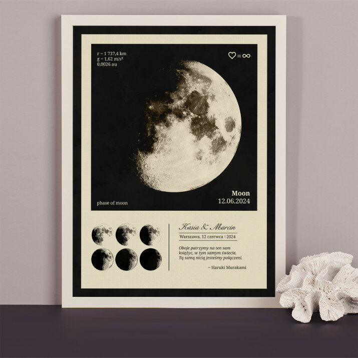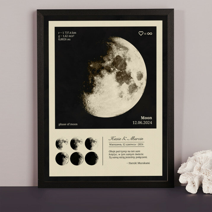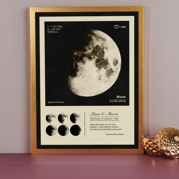 Wyjątkowy plakat z mapą księżyca w ramce to piękna i oryginalna pamiątka ważnego dla Ciebie momentu. Podanie wybranego miasta i daty pozwala odtworzyć wygląd księżyca z tego dnia. Personalizacja obejmuje także podane przez Ciebie imiona oraz dedykację, dzięki którym taki wydruk stanie się bardzo osobistym i niepowtarzalnym podarunkiem. Dodatkowe informacje:Końcowy produkt to wydruk plakatu na papierze fotograficznym obramowany w ramkę 30 x 40 cm w jednym z trzech kolorów do wyboru: czarnym, białym lub złotym