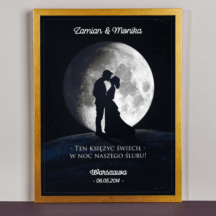 Wyjątkowy plakat z mapą księżyca w ramce to piękna i oryginalna pamiątka ważnego dla Ciebie momentu. Podanie wybranego miasta i daty pozwala odtworzyć wygląd księżyca z tego dnia. Personalizacja obejmuje także podane przez Ciebie imiona oraz dedykację, dzięki którym taki wydruk stanie się bardzo osobistym i niepowtarzalnym podarunkiem. Dodatkowe informacje:Końcowy produkt to wydruk plakatu na papierze fotograficznym obramowany w ramkę 30 x 40 cm w jednym z trzech kolorów do wyboru: czarnym, białym lub złotym