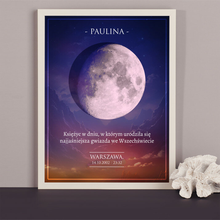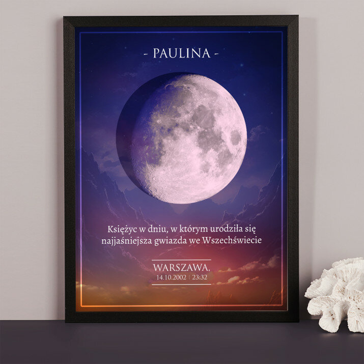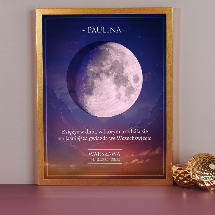 Wyjątkowy plakat z mapą księżyca w ramce to piękna i oryginalna pamiątka ważnego dla Ciebie momentu. Podanie wybranego miasta i daty pozwala odtworzyć wygląd księżyca z tego dnia. Personalizacja obejmuje także podane przez Ciebie imiona oraz dedykację, dzięki którym taki wydruk stanie się bardzo osobistym i niepowtarzalnym podarunkiem. Dodatkowe informacje:Końcowy produkt to wydruk plakatu na papierze fotograficznym obramowany w ramkę 30 x 40 cm w jednym z trzech kolorów do wyboru: czarnym, białym lub złotym