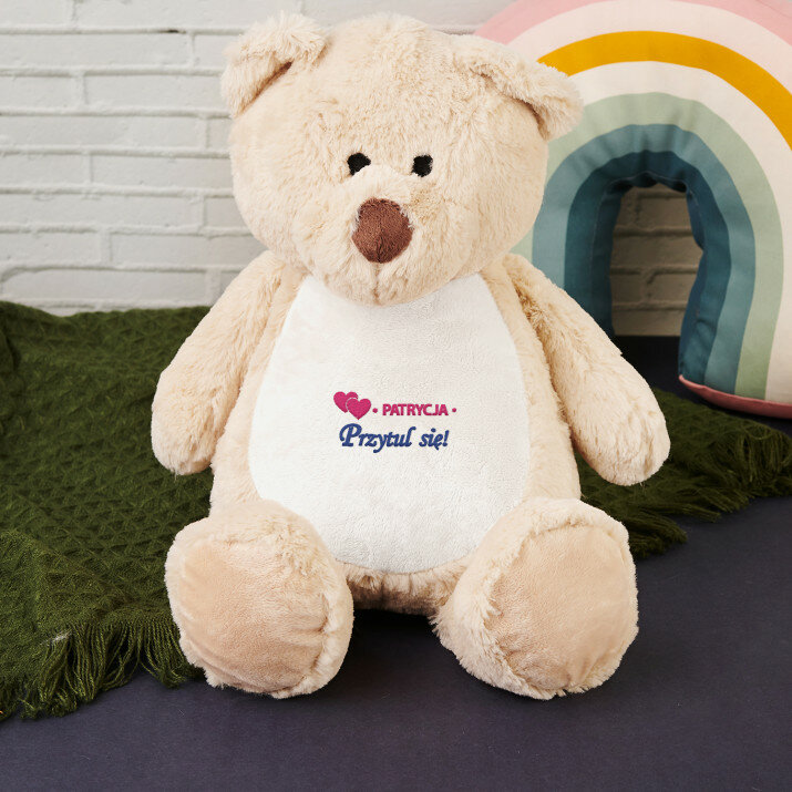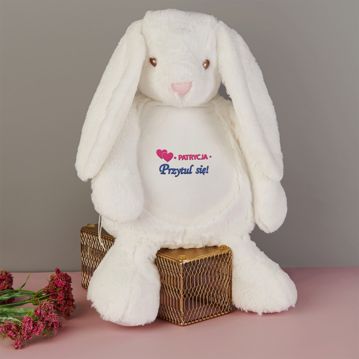Duży i niezwykle miękki pluszak miś albo królik, ozdobiony jednym z naszych personalizowanych haftowanych wzorów. Zabawka pluszowa, skład: 100% poliester. Maskotka posiada unikalny zamek błyskawiczny, który umożliwia wyjęcie wnętrza i bezproblemowe czyszczenie. Miś jest bezpieczny dla dzieci w każdym wieku. Tylko pranie ręczne. Wysokość pluszaka: 45 cm.