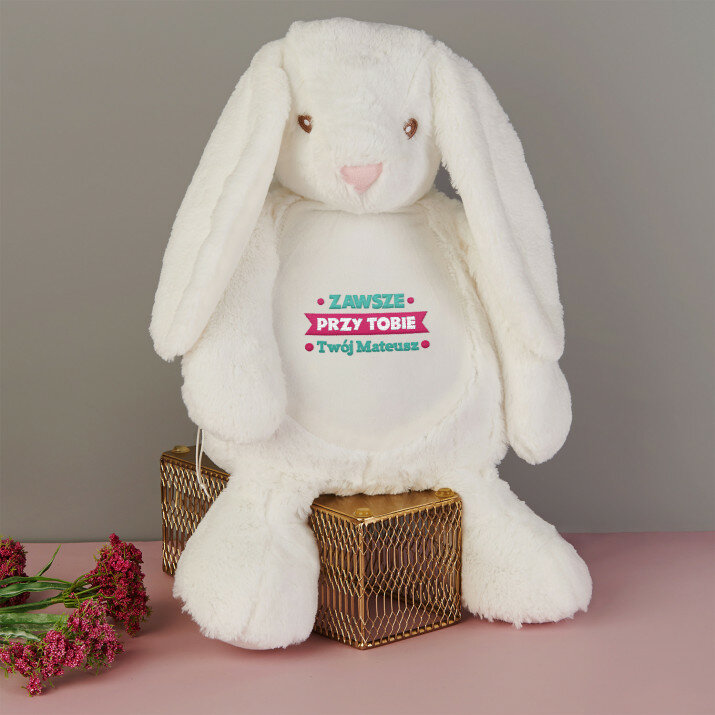 Duży i niezwykle miękki pluszak miś albo królik, ozdobiony jednym z naszych personalizowanych haftowanych wzorów. Zabawka pluszowa, skład: 100% poliester. Maskotka posiada unikalny zamek błyskawiczny, który umożliwia wyjęcie wnętrza i bezproblemowe czyszczenie. Miś jest bezpieczny dla dzieci w każdym wieku. Tylko pranie ręczne. Wysokość pluszaka: 45 cm.