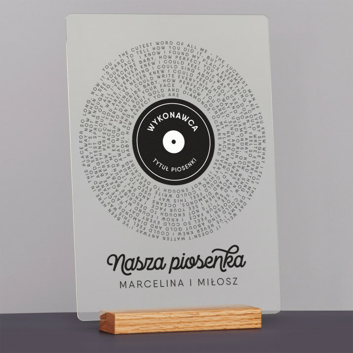 Wydruk na szkle akrylowym z podstawką drewnianą.