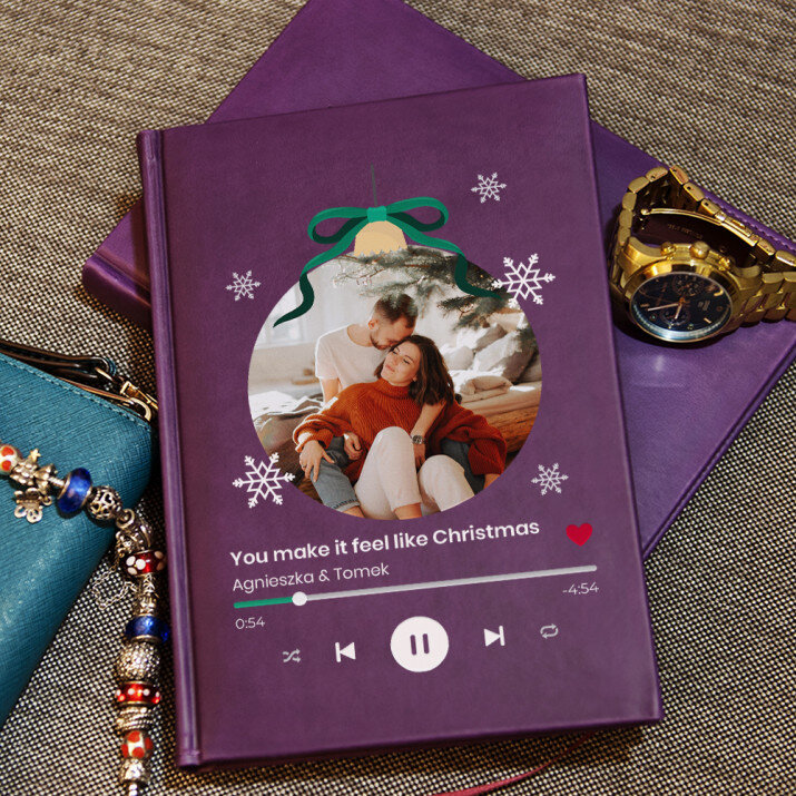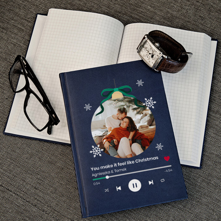 Notatnik książkowy w formacie A5 z wysokiej jakości nadrukiem UV.Notatnik wykończony jest miękkim materiałem i obszyty na brzegach.