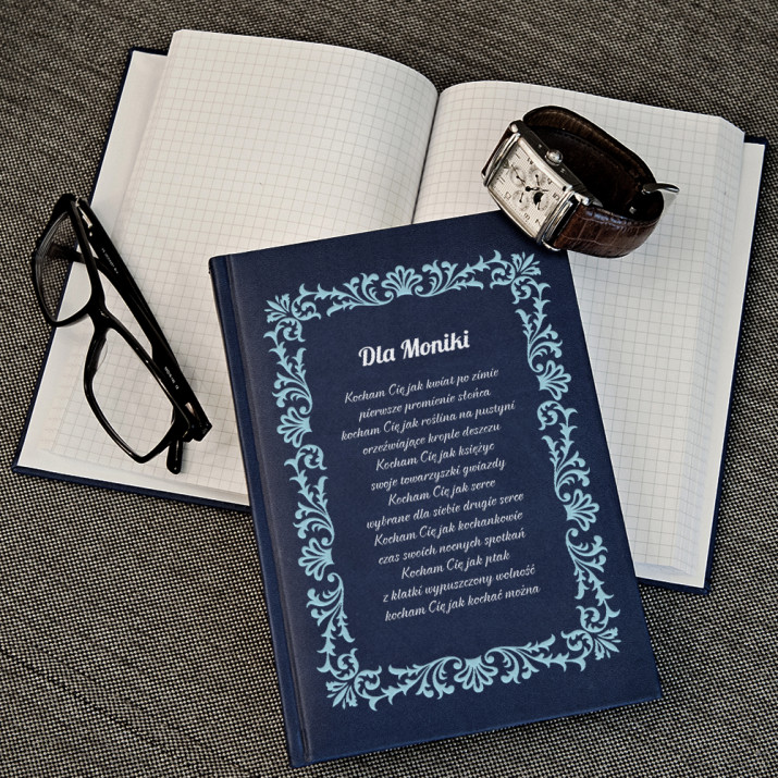 Notatnik książkowy w formacie A5 z wysokiej jakości nadrukiem UV.Notatnik wykończony jest miękkim materiałem i obszyty na brzegach.