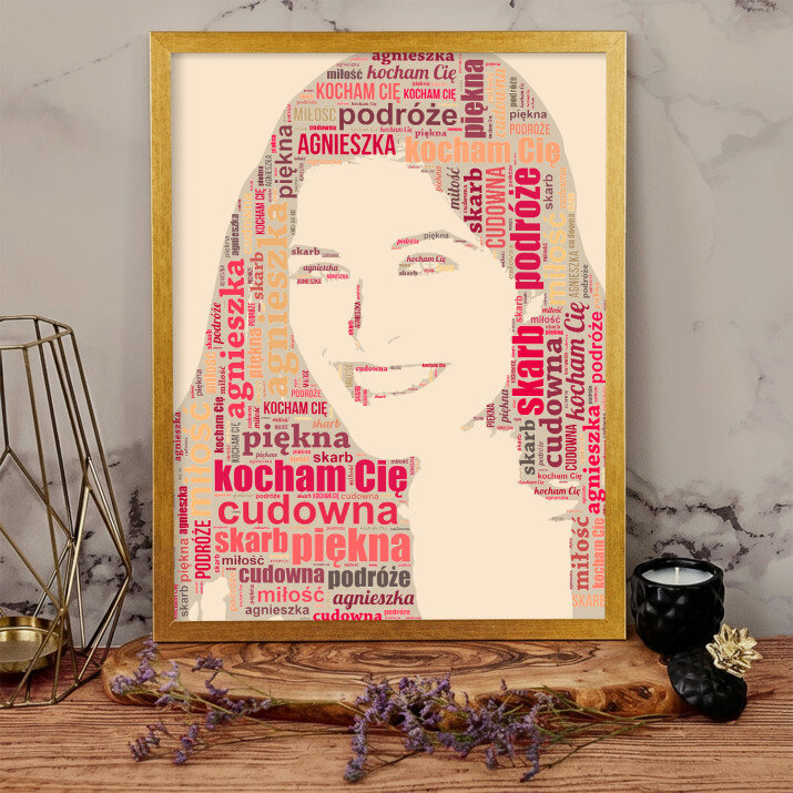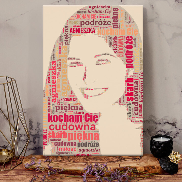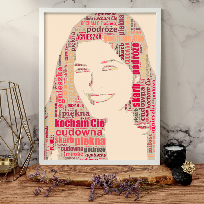 Obraz Chmura Słów pokaże Twoje zdjęcie ze słów, które nam prześlesz. Całkowicie unikalne spojrzenie na zdjęcie stworzy obraz, który zaskoczy oglądających.STYLOWY PORTRET