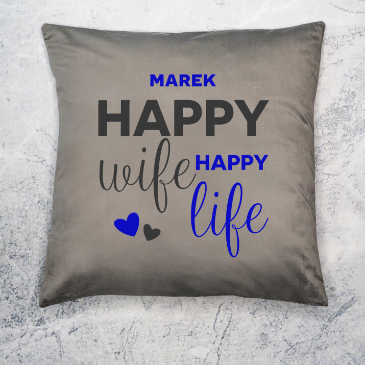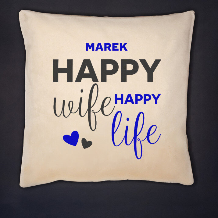 Poducha “happy life” to idealny wskaźnik życia codziennego, bo kiedy żona jest zadowolona, mąż ma święty spokój. Idealny prezent urodzinowy, imieninowy dla męża.WYKONANIE