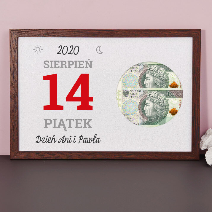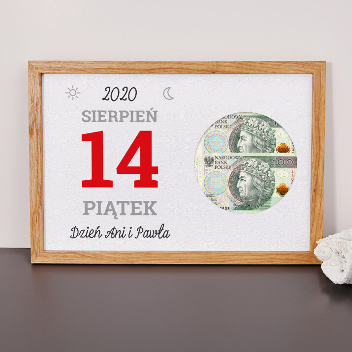 Ramka na pieniądze to fantastyczny pomysł na prezent na wiele okazji, który zaskoczy swoją oryginalną formą. Zamiast koperty możesz wręczyć wyjątkowy wydruk oprawiony w ramkę! Taka forma upominku z pewnością zachwyci każdego obdarowanego. Dodaj dedykację i spersonalizuj swój upominek, tak aby był wyjątkowy dla bliskiej osoby!Wymiary ramki: 20 x 30cm