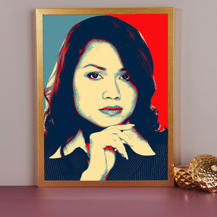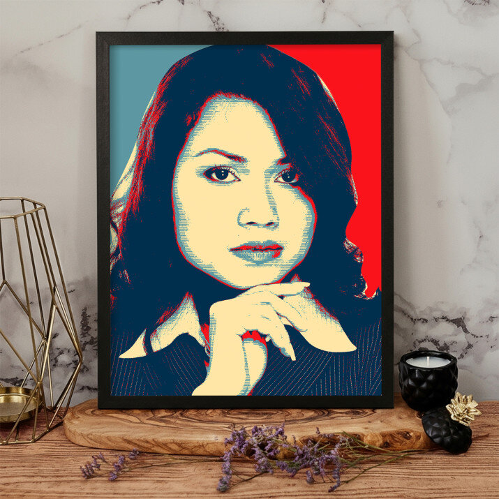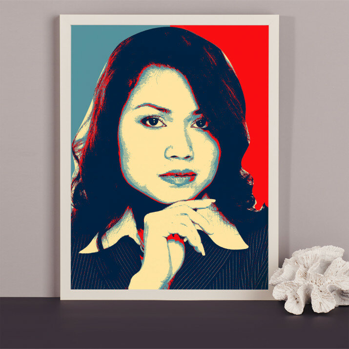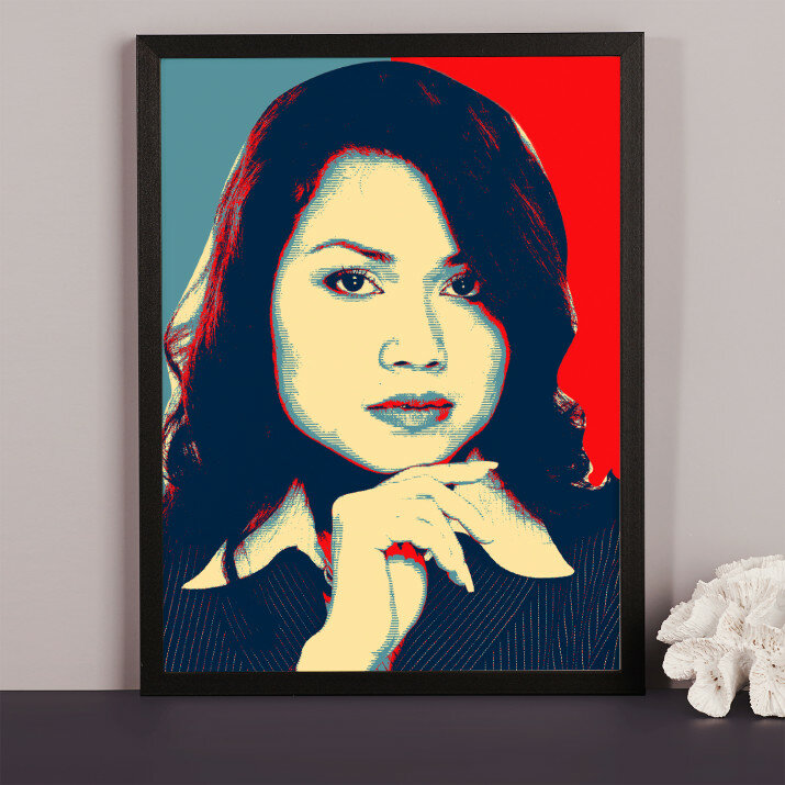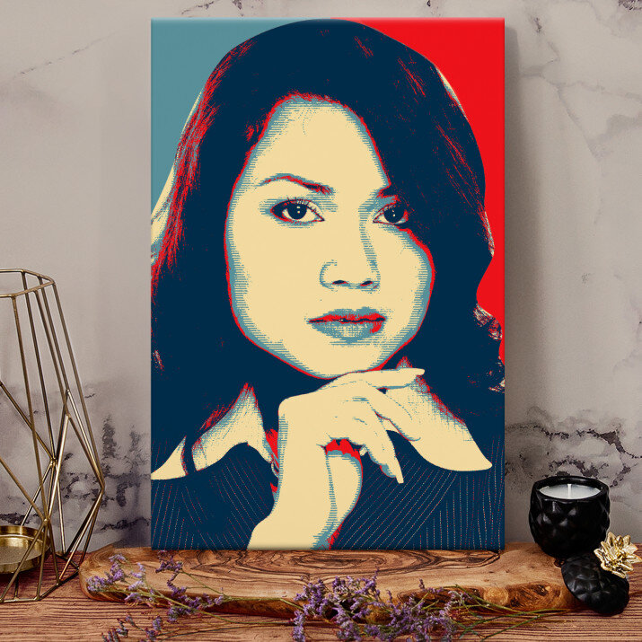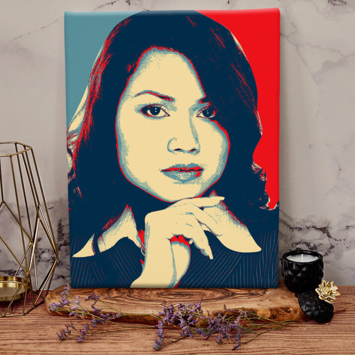 Obraz Hope stylizowany na plakat wyborczy Baracka Obamy, dzięki wyjątkowemu połączeniu kolorów i mocnych akcentów, nada Twojemu wnętrzu nowy charakter.STYLOWY PORTRET