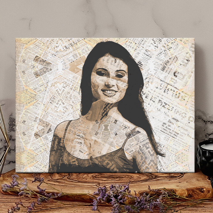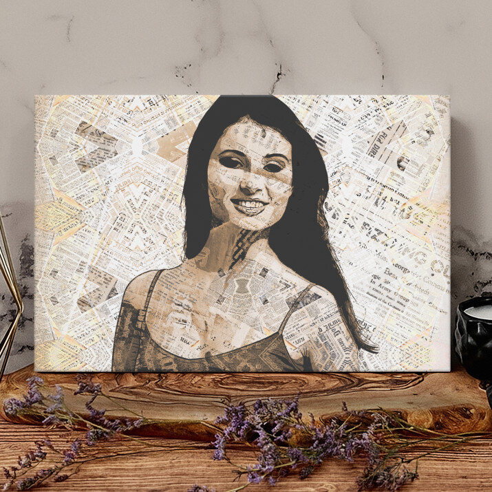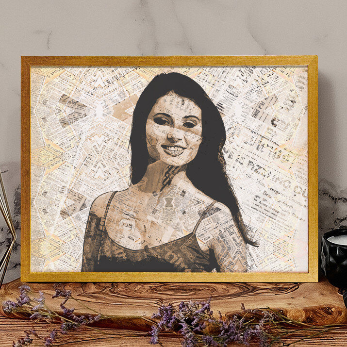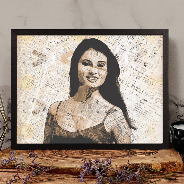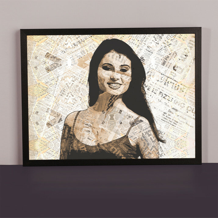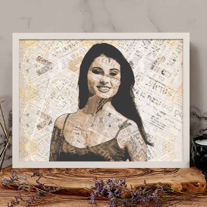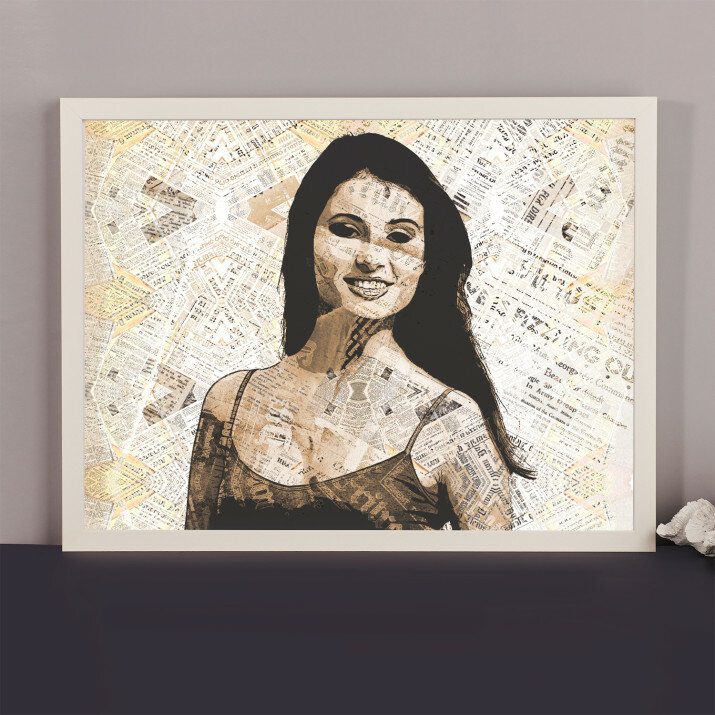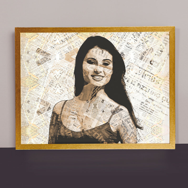 Newspaper Pop Art zainspirowany został połączeniem wycinków z gazet, które tworzą wzór. Postać wygląda jak namalowana farbami olejnymi z mocnymi kolorami.STYLOWY PORTRET