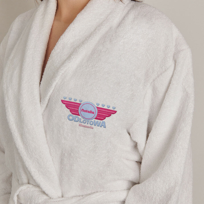 Uniwersalny szlafrok w kolorze białym, wykonany ze 100% bawełny frotte. Wygodny, ładny, mięciutki - zapewni doskonały komfort, gdy wszystkie troski dnia odejdą w dal i nadejdzie czas na relaks. Ogrzeje również zaspane ciałko zaraz po przebudzeniu. Szlafrok ozdobiony jest personalizowanym haftem, który pięknie wygląda, poprawia samopoczucie i zamienia produkt w wyjątkowy upominek!Szlafrok ma elegancki fason z kołnierzykiem i kieszeniami, aby można było zabłysnąć na wieczornym pokazie mody podomowej. Rozmiar szlafroka uniwersalny, gramatura 350 g/m2. Unisex.