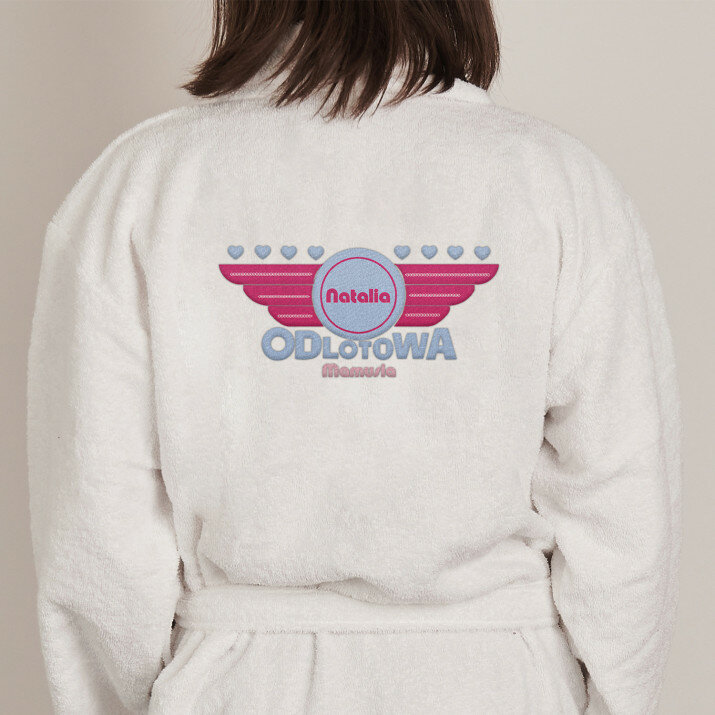 Do wyboru są dwa umiejscowienia haftu - z przodu lub na plecach. Prosimy zaznaczyć jedną z opcji do wyboru w odpowiednim polu personalizacji.Haft na szlafroku wykonany jest za pomocą hafciarki komputerowej. Używamy hafciarki japońskiej produkcji, firmy HappyJapan Inc. - jednego z najbardziej doświadczonych producentów tego typu maszyn na świecie! Dzięki profesjonalnej maszynie i naszym pomysłowym grafikom powstaje niepowtarzalny haft z precyzyjnym odwzorowaniem projektu widocznym w najmniejszym ściegu.