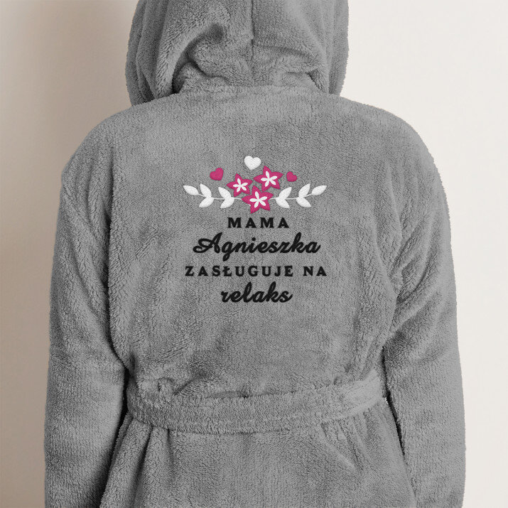 Uniwersalny szlafrok polarowy w kolorze szarym, wykonany ze 100% poliestru wellsoft. Wygodny, ładny, mięciutki - zapewni doskonały komfort, gdy wszystkie troski dnia odejdą w dal i nadejdzie czas na relaks. Ogrzeje również zaspane ciałko zaraz po przebudzeniu. Szlafrok ozdobiony jest personalizowanym haftem, który pięknie wygląda, poprawia samopoczucie i zamienia produkt w wyjątkowy upominek!Szlafrok ma elegancki fason z kapturem i kieszeniami, aby można było zabłysnąć na wieczornym pokazie mody podomowej. Rozmiar szlafroka uniwersalny, gramatura 300 g/m2. Unisex.