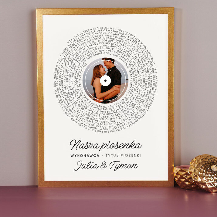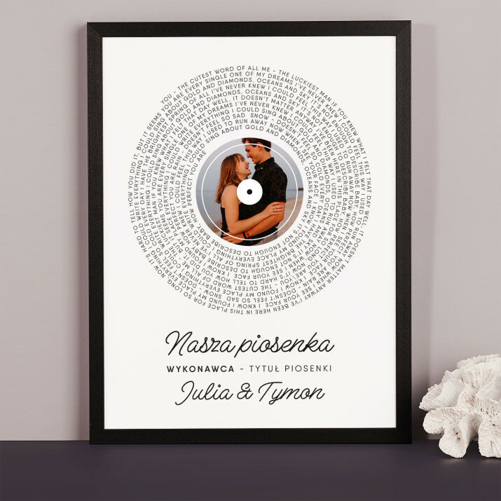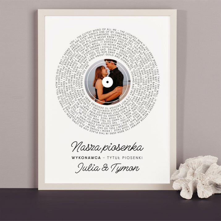 Piosenka to niezwykle silny nośnik wspomnień. Pewnie nieraz zdarzyło Ci się usłyszeć ulubiony utwór sprzed lat i natychmiast przenieść się do tamtych czasów i chwil, które przeżywałeś. Są też takie piosenki, które kojarzą nam się z jedną osobą albo wyjazdem, na którym byliśmy z bliskimi. Nie mówiąc nawet o zakochanych, bo przecież każda miłosna piosenka opowiada o ich uczuciu. Naszym zdaniem podarunek w postaci wydruku z tekstem wyjątkowej piosenki jest doskonałym pomysłem!Wybrany przez Ciebie tekst na wydruku układamy w kształt płyty winylowej, co wygląda bardzo elegancko. Kompozycję uzupełniają personalizowane elementy, a gotowy upominek jest jedyny w swoim rodzaju. Spraw komuś niespodziankę i podaruj najpiękniejszą pamiątkę z muzycznym akcentem.