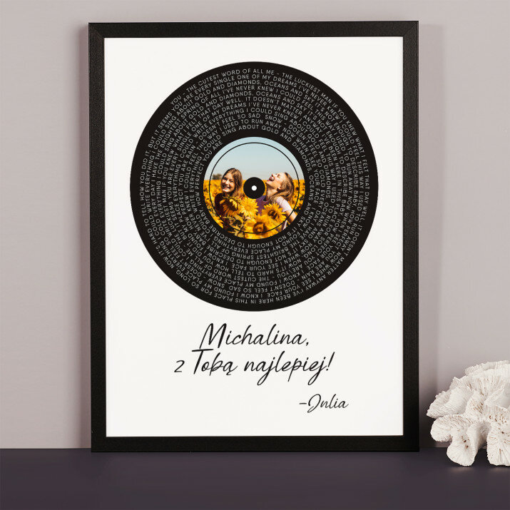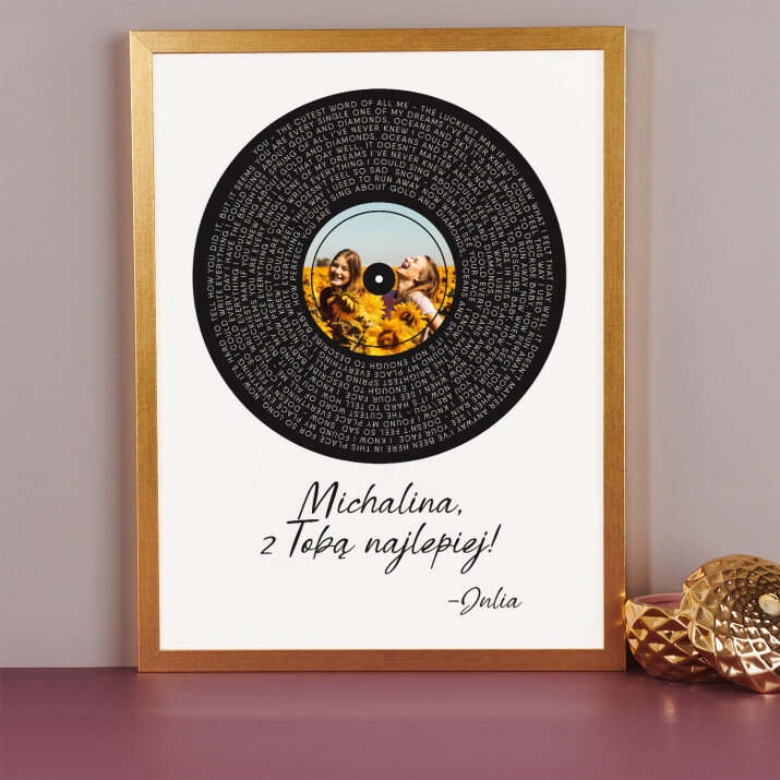 Piosenka to niezwykle silny nośnik wspomnień. Pewnie nieraz zdarzyło Ci się usłyszeć ulubiony utwór sprzed lat i natychmiast przenieść się do tamtych czasów i chwil, które przeżywałeś. Są też takie piosenki, które kojarzą nam się z jedną osobą albo wyjazdem, na którym byliśmy z bliskimi. Nie mówiąc nawet o zakochanych, bo przecież każda miłosna piosenka opowiada o ich uczuciu. Naszym zdaniem podarunek w postaci wydruku z tekstem wyjątkowej piosenki jest doskonałym pomysłem!Wybrany przez Ciebie tekst na wydruku układamy w kształt płyty winylowej, co wygląda bardzo elegancko. Kompozycję uzupełniają personalizowane elementy, a gotowy upominek jest jedyny w swoim rodzaju. Spraw komuś niespodziankę i podaruj najpiękniejszą pamiątkę z muzycznym akcentem.