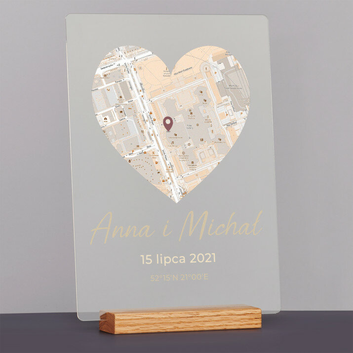 Czasami wystarczy zamknąć oczy, żeby przenieść się do miejsc, które wiele dla nas znaczą. Zazwyczaj dzielimy je z ukochaną osobą, rodziną albo przyjaciółmi. Kojarzą nam się z wyjątkowymi i najważniejszymi chwilami. Te wspólne wspomnienia można symbolicznie przenieść na niezwykły upominek, który zachwyci bliską osobę.Dzięki podanej przez Ciebie lokalizacji prezent będzie idealny na ślub, rocznicę albo walentynki. Doskonale sprawdzi się także jako pamiątka dla przyjaciół. Wybrana przez Ciebie lokalizacja (jedna lub więcej - w zależności od wybranego wzoru), uzupełniona personalizowanymi elementami, wygląda niezwykle elegancko. Taki upominek jest jedyny w swoim rodzaju!