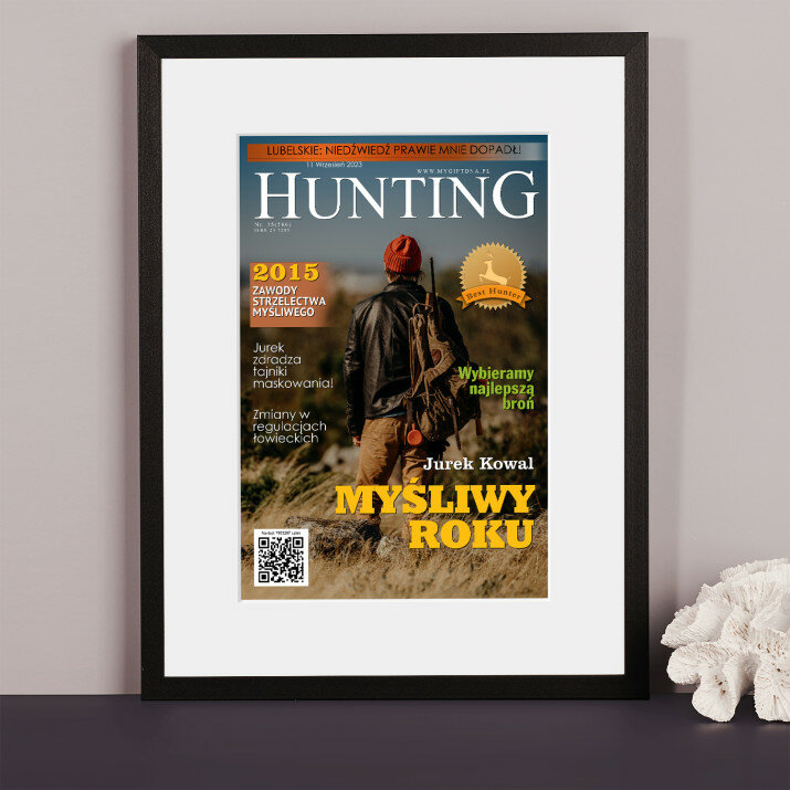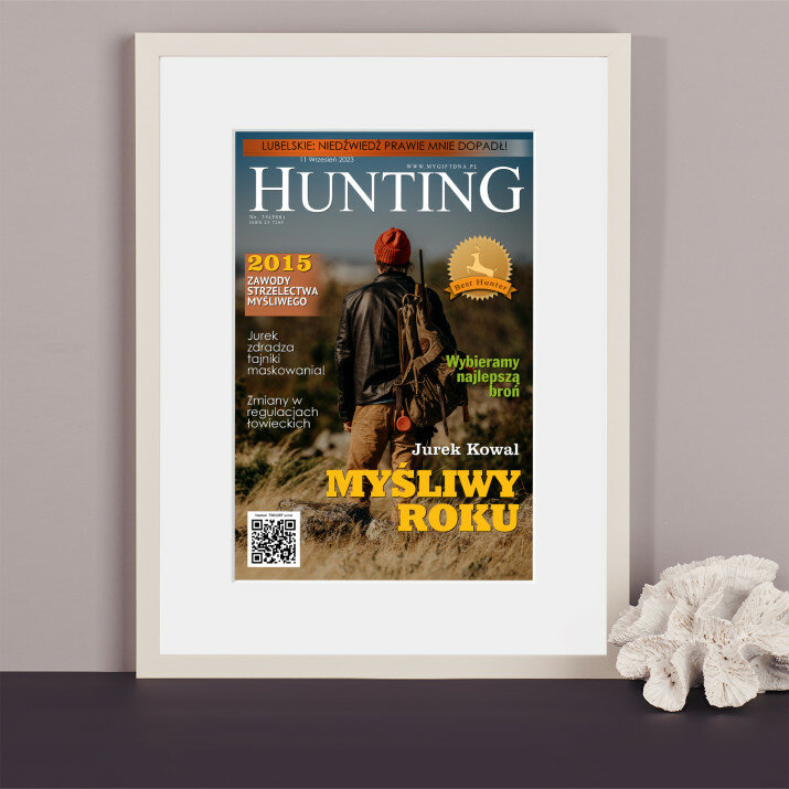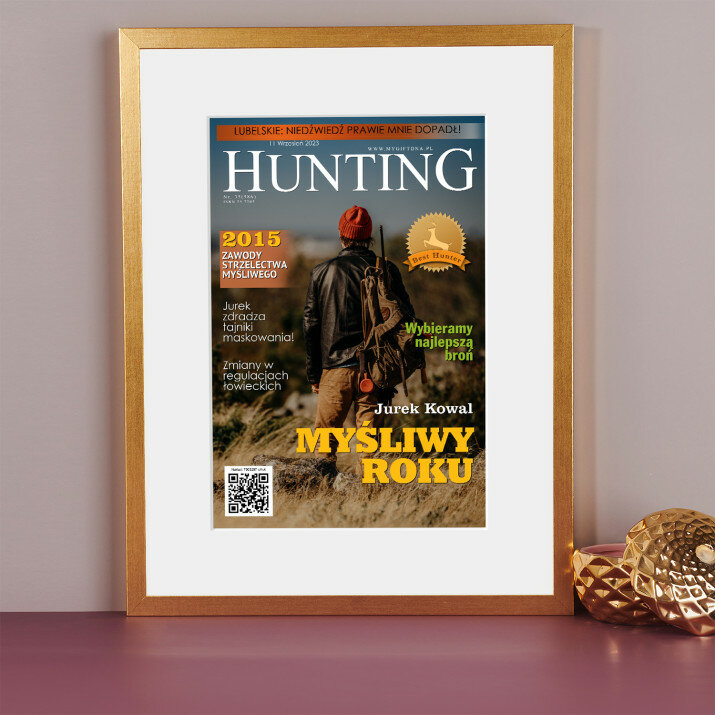Okładka magazynu "Hunting" wykonana perfekcyjnie według mojego projektu, dopasowane napisy zgodnie z moimi wskazówkami, całość prezentuje się niezwykle profesjonalnie. Oprawiona w solidną ramkę, która dodaje elegancji i charakteru. Personalizacja została wykonana z ogromną dbałością o szczegóły. Przesyłka dotarła błyskawicznie, bardzo dobrze zabezpieczona na czas transportu. Świetny pomysł na wyjątkowy, oryginalny prezent ? gorąco polecam!