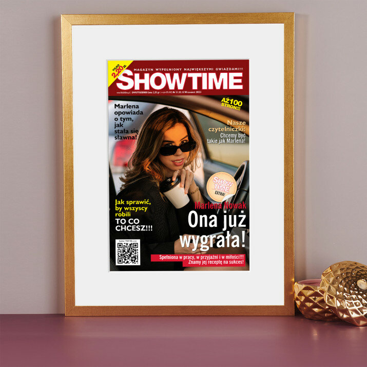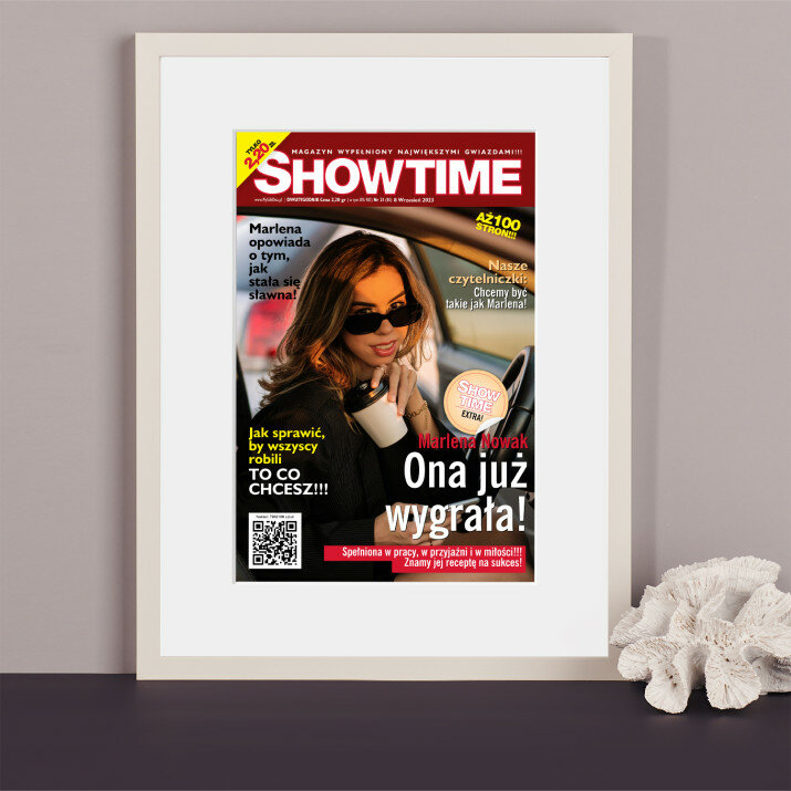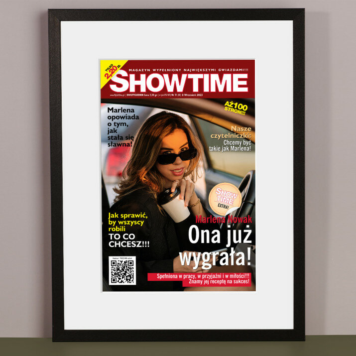 Okładka Showtime w ramce czarnej to elegancki dodatek do wystroju wnętrza. Pięknie wyeksponowana.