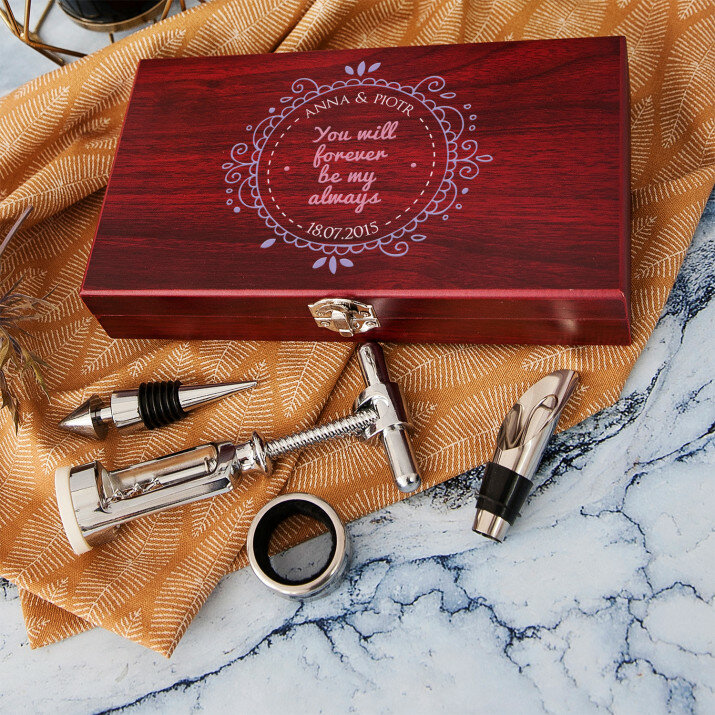 Piękny, czteroczęściowy zestaw do wina w eleganckim drewnianym pudełku z grawerem na pokrywce.Do wyboru są dwie wersje: